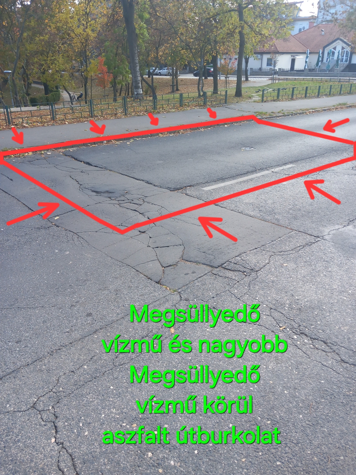 Értesítem hogy 85 ös, 85E és 117 es autóbusz vonalán a Mélytó utca és Bányató utcai körforgalom között találkozásán, pirossal jelölve vízmű és vízmű körül útburkolatán nagyobb megüllyedés látható, észlelhető
