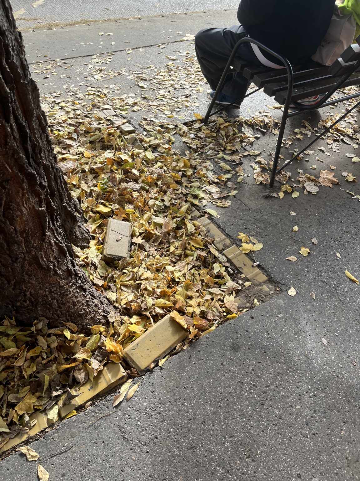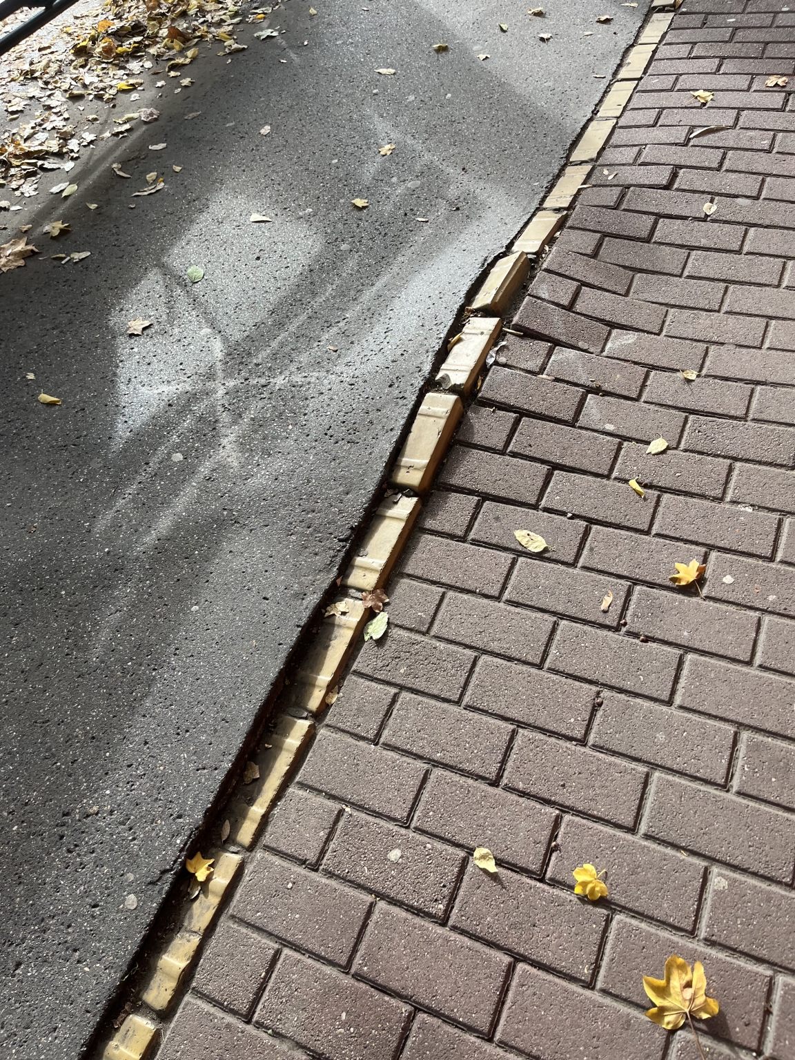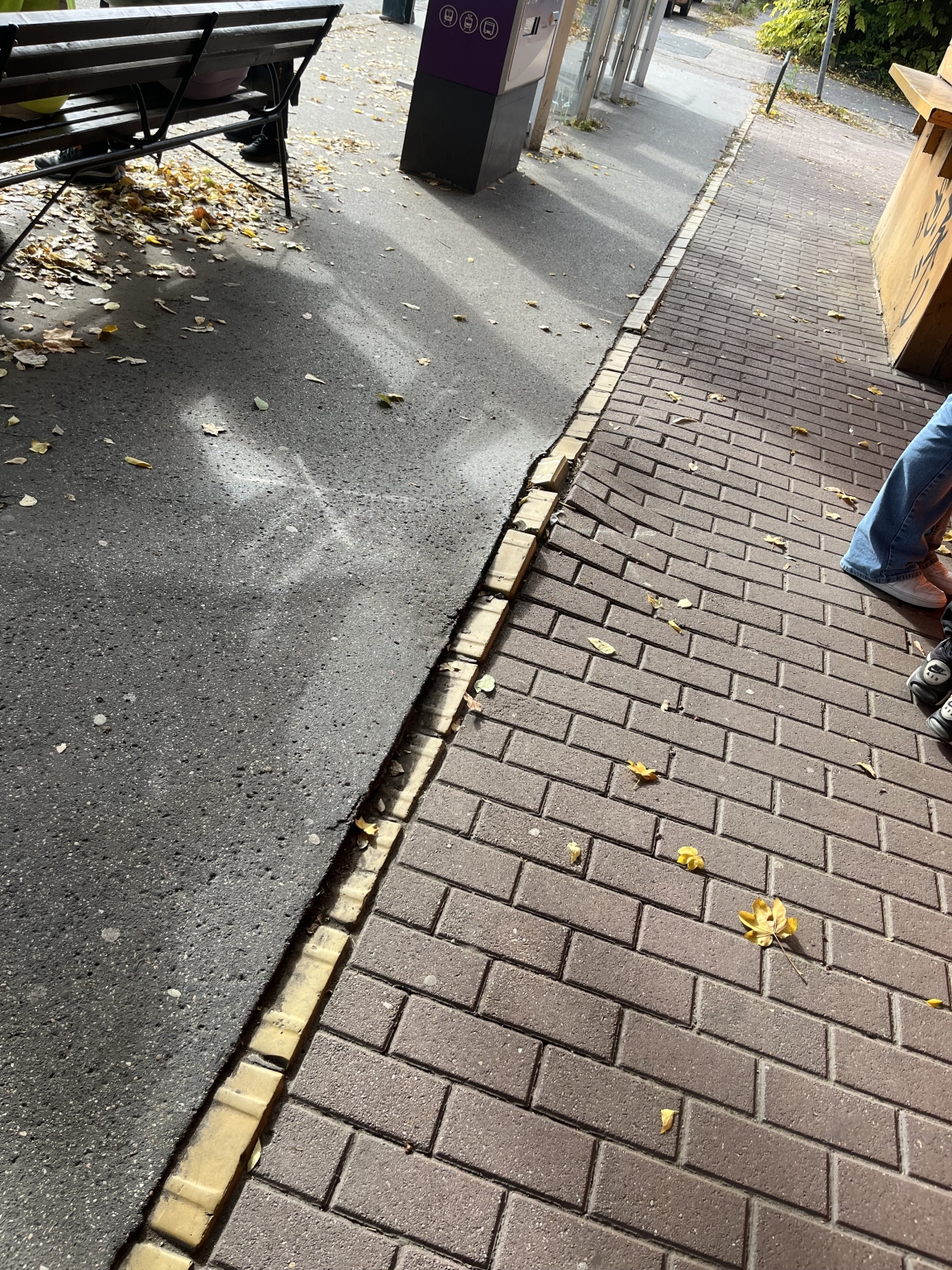 A szakrendelő előtti biszmegqllóban fel van gyűrődve a jarda. Balesetveszélyes. A pad alatt is, az a fotón nem látszik jól