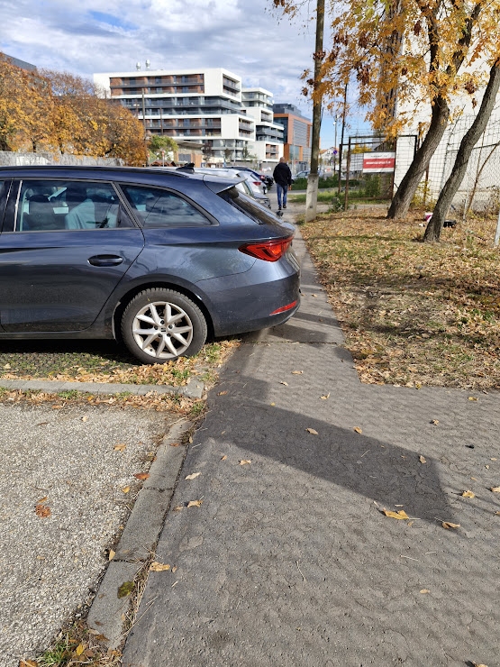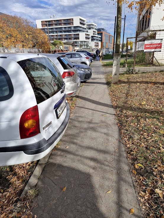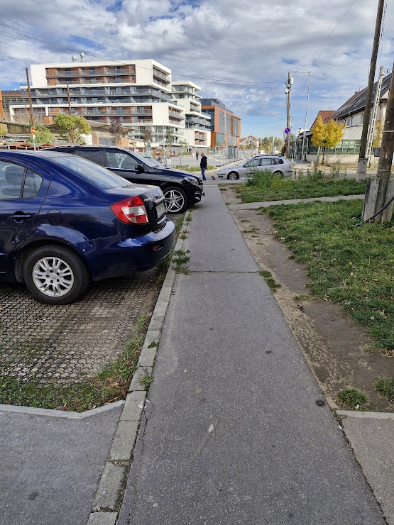 Kérjük, hogy vagy a járdát szélesítsék ki szabvány méretűvé - legalább 1,5 méteresre - vagy/és helyezzenek el parkolásgátló bakokat, hogy az autók ne tudjanak fizikailag fellógni a járdára.