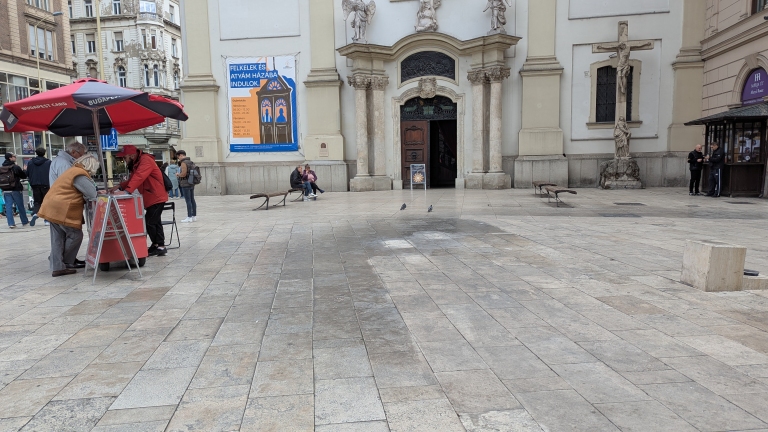 Nem tudom, hogy milyen bódé állt a Ferenciek terén a kút mellett, de az olyan forgalmat és szennyezést generált, amely elbontása után is jól látható a burkolaton.