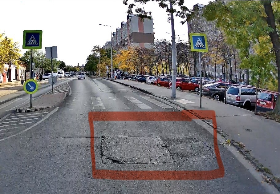 Berepedt, megsüllyedt, kátyúsodott útrész.