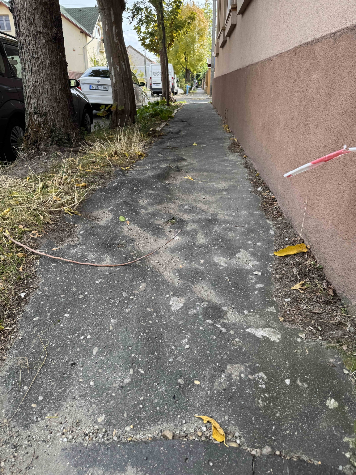 A járdát a fa gyökerei felnyomták, életveszélyes a közlekedés rajta. Megáll a víz, csúszik. Biztos bokaficam.
