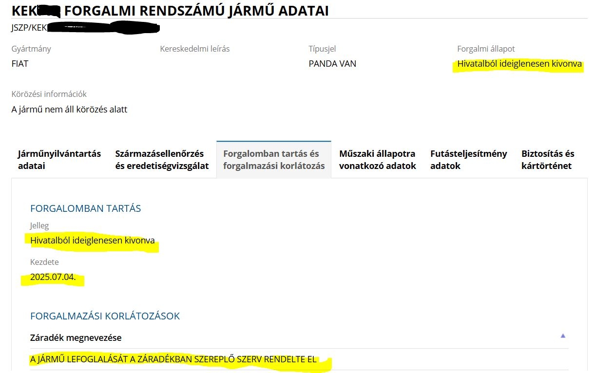A gépkocsi 2025.07.04. óta "hivatalból ideiglenesen kivonva".