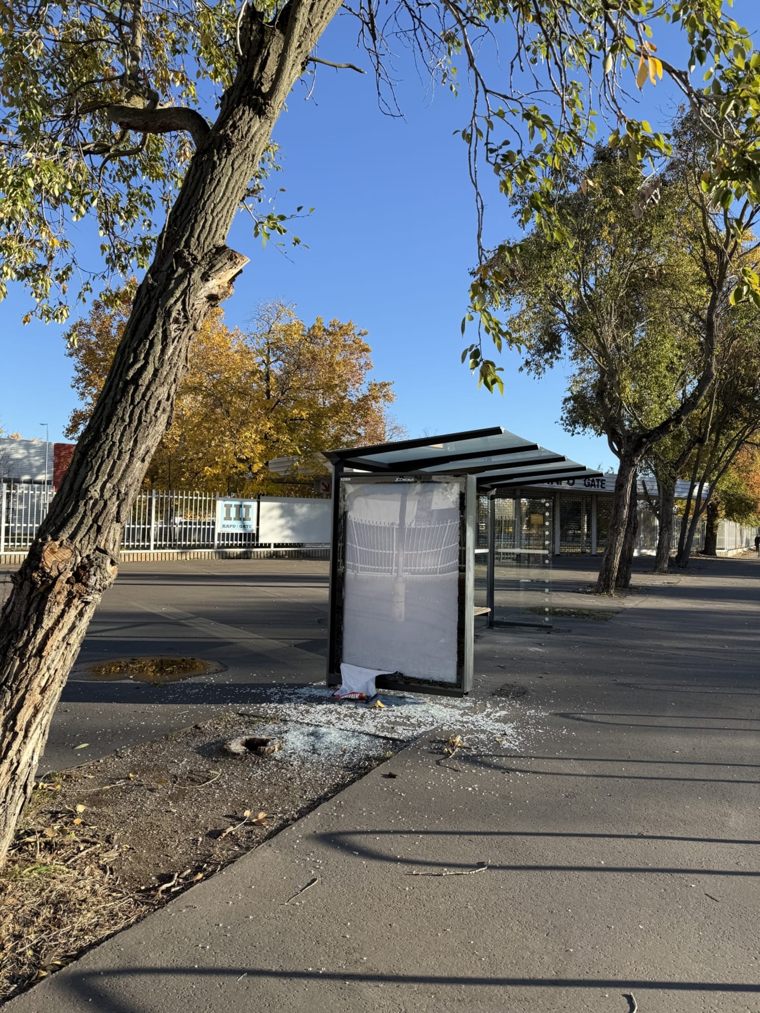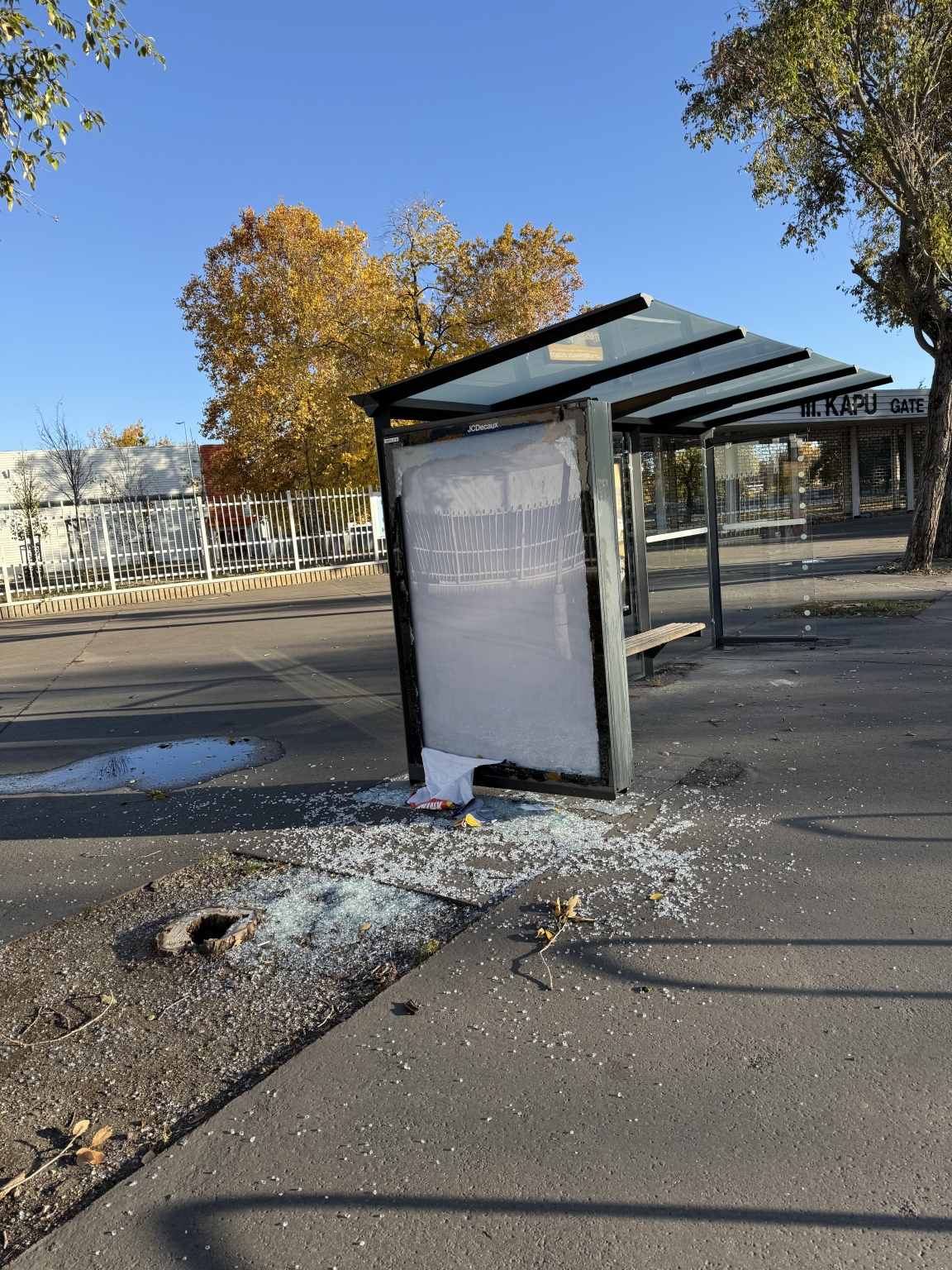 Az albertirsai úton eltört egy citylight a 10-es busz megállójában a Hungexpo 3-mas kapujánál. Mindenhol üvegtörmelék.