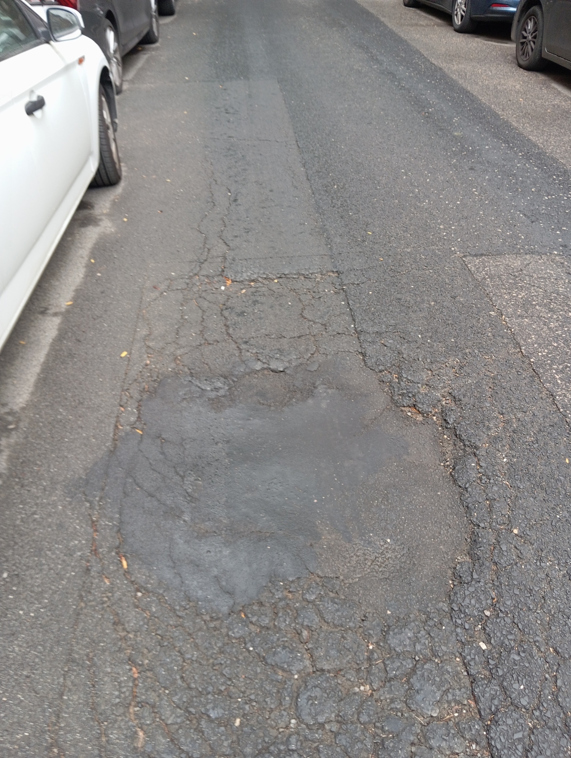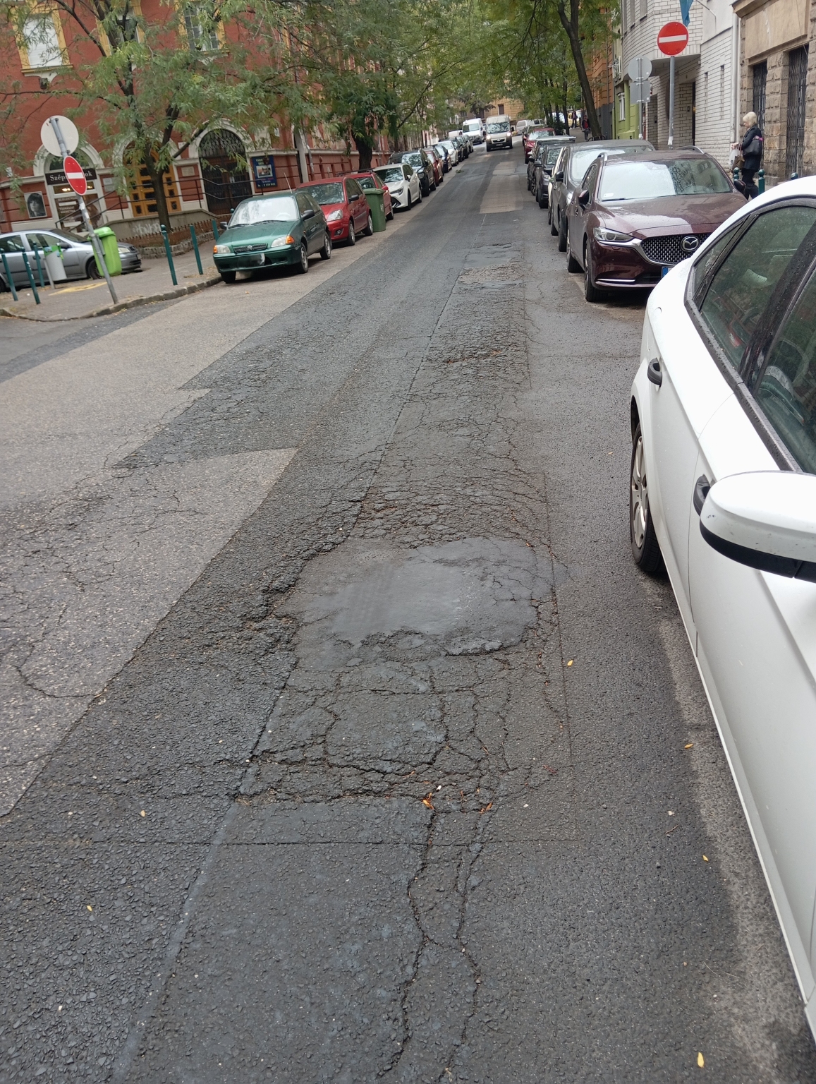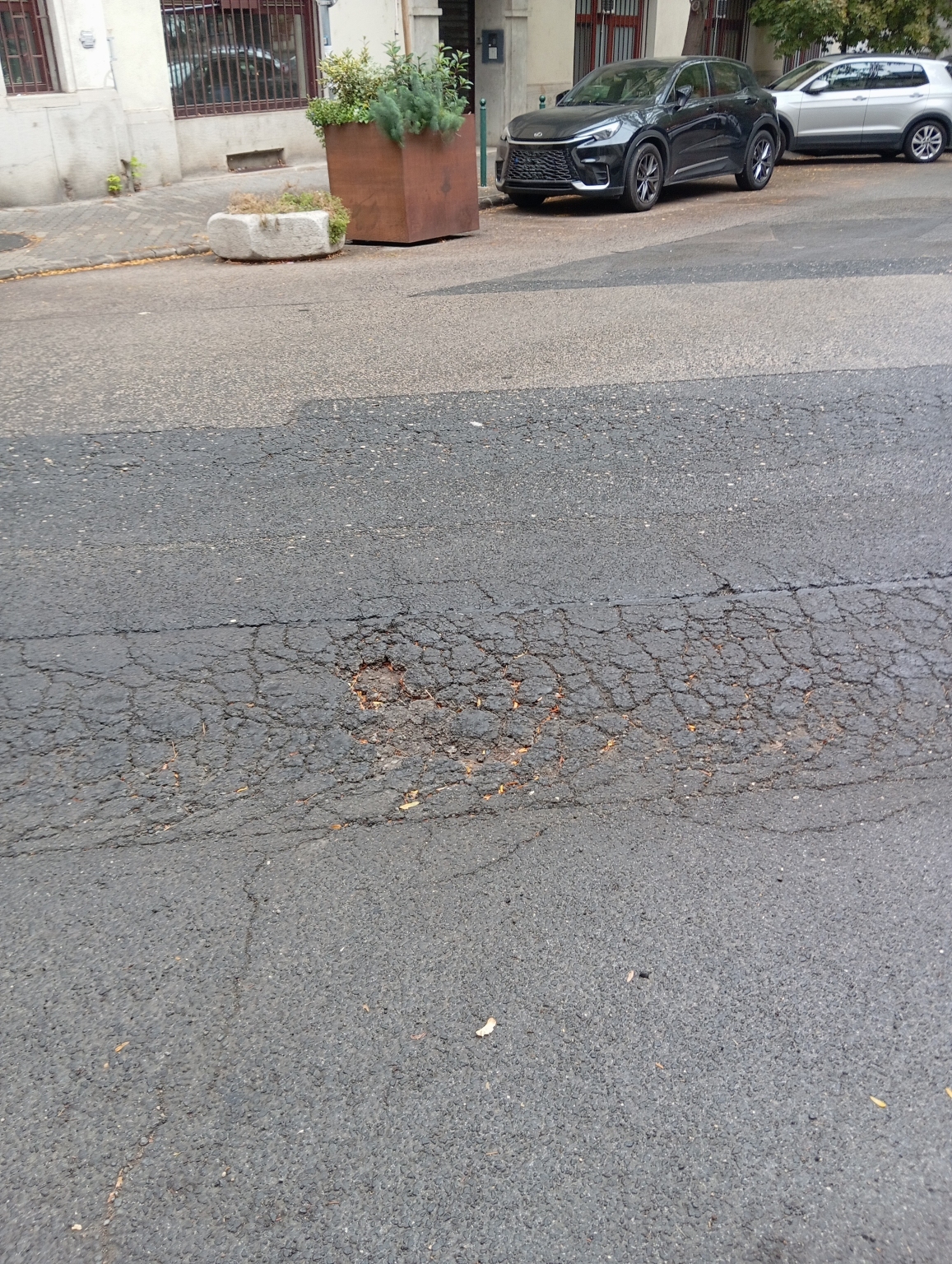 Kérem az illetékest, hogy a képen látható, nagyon rossz állapotú aszfaltot legyenek szívesek felszedni, és újraburkolni!