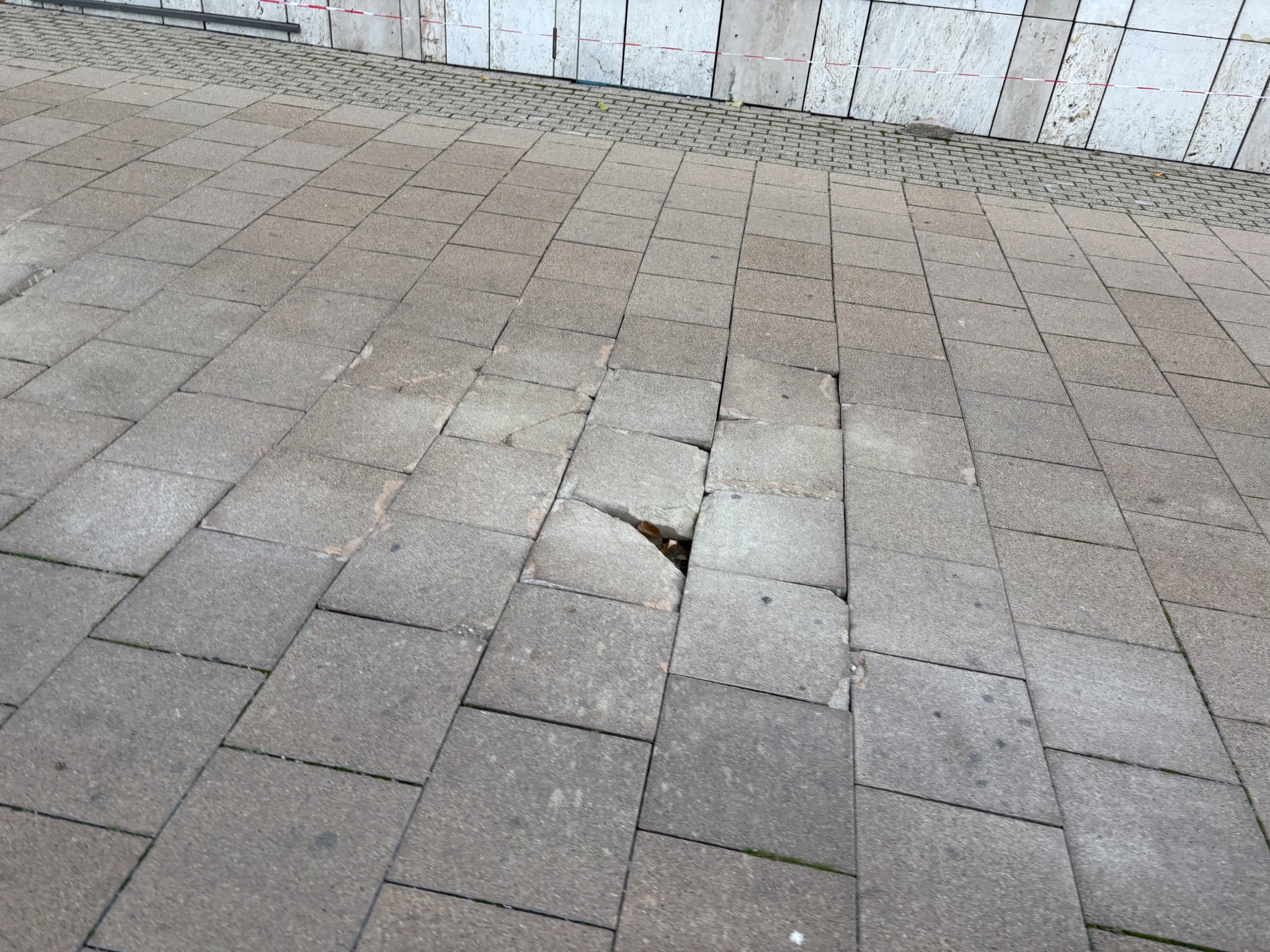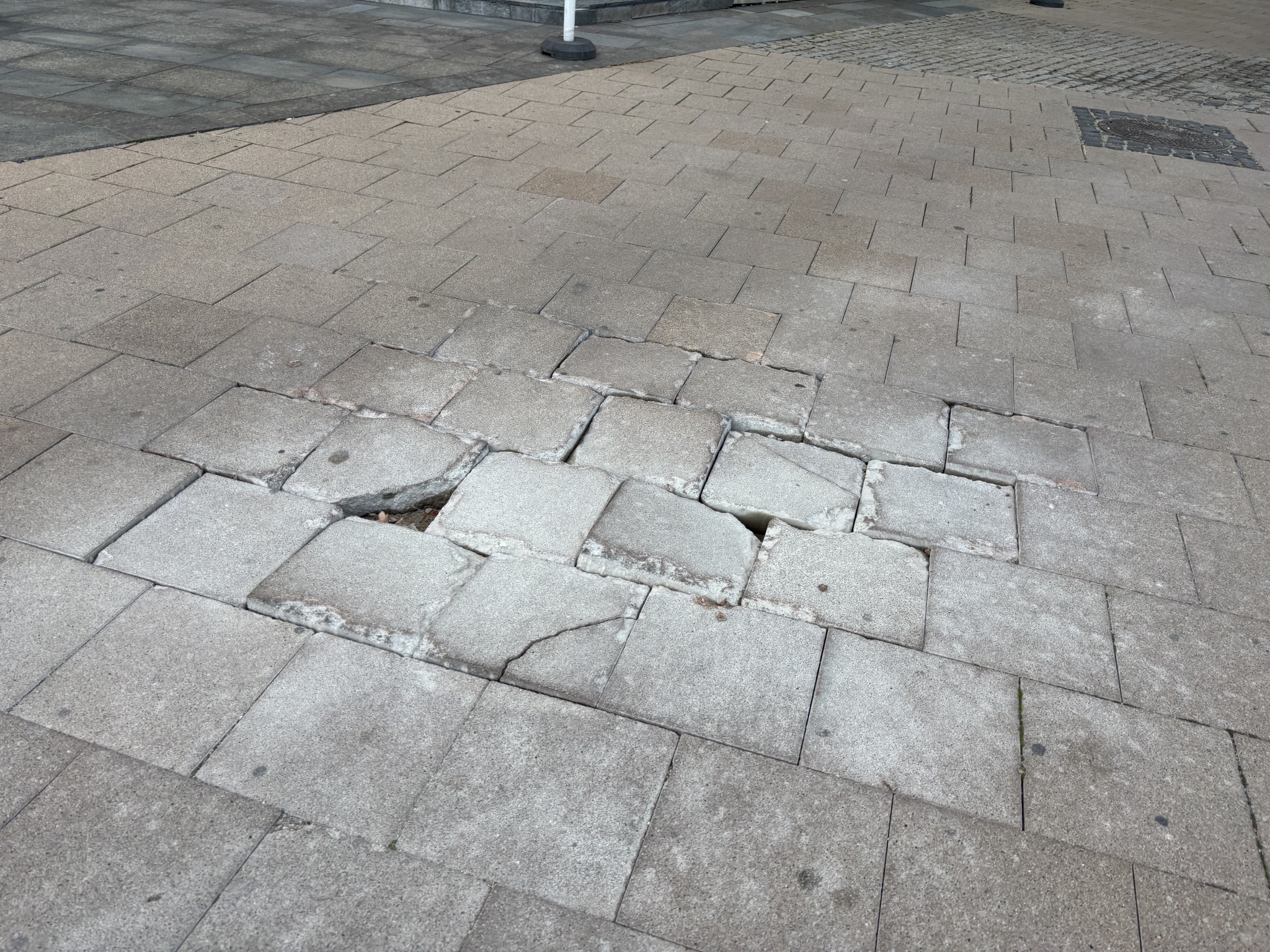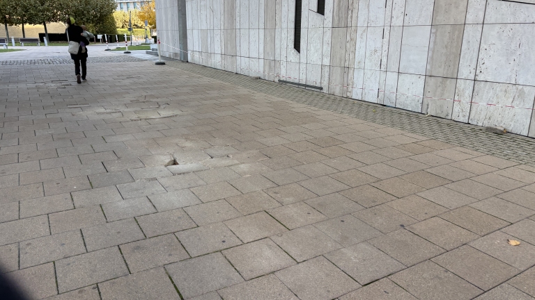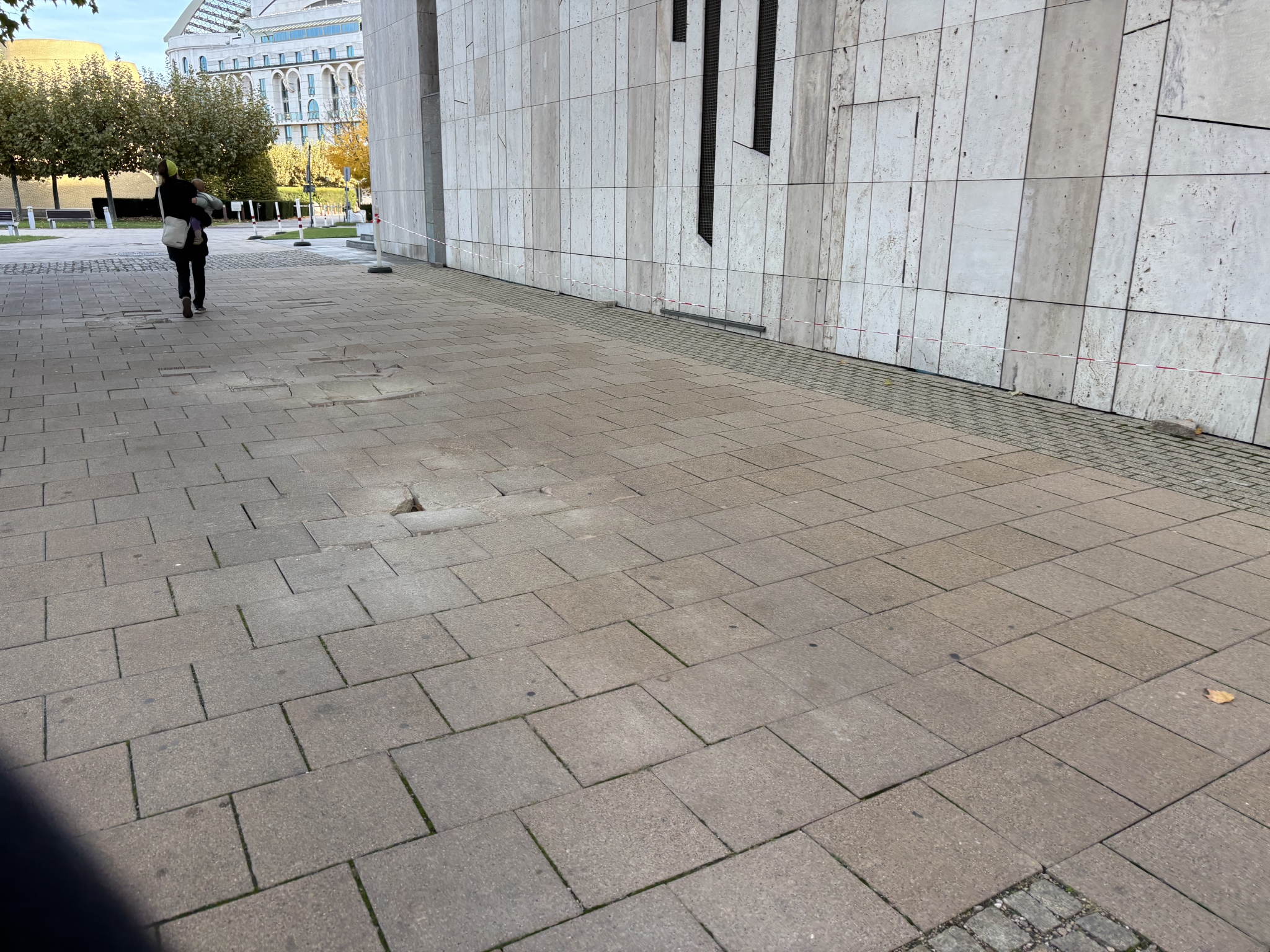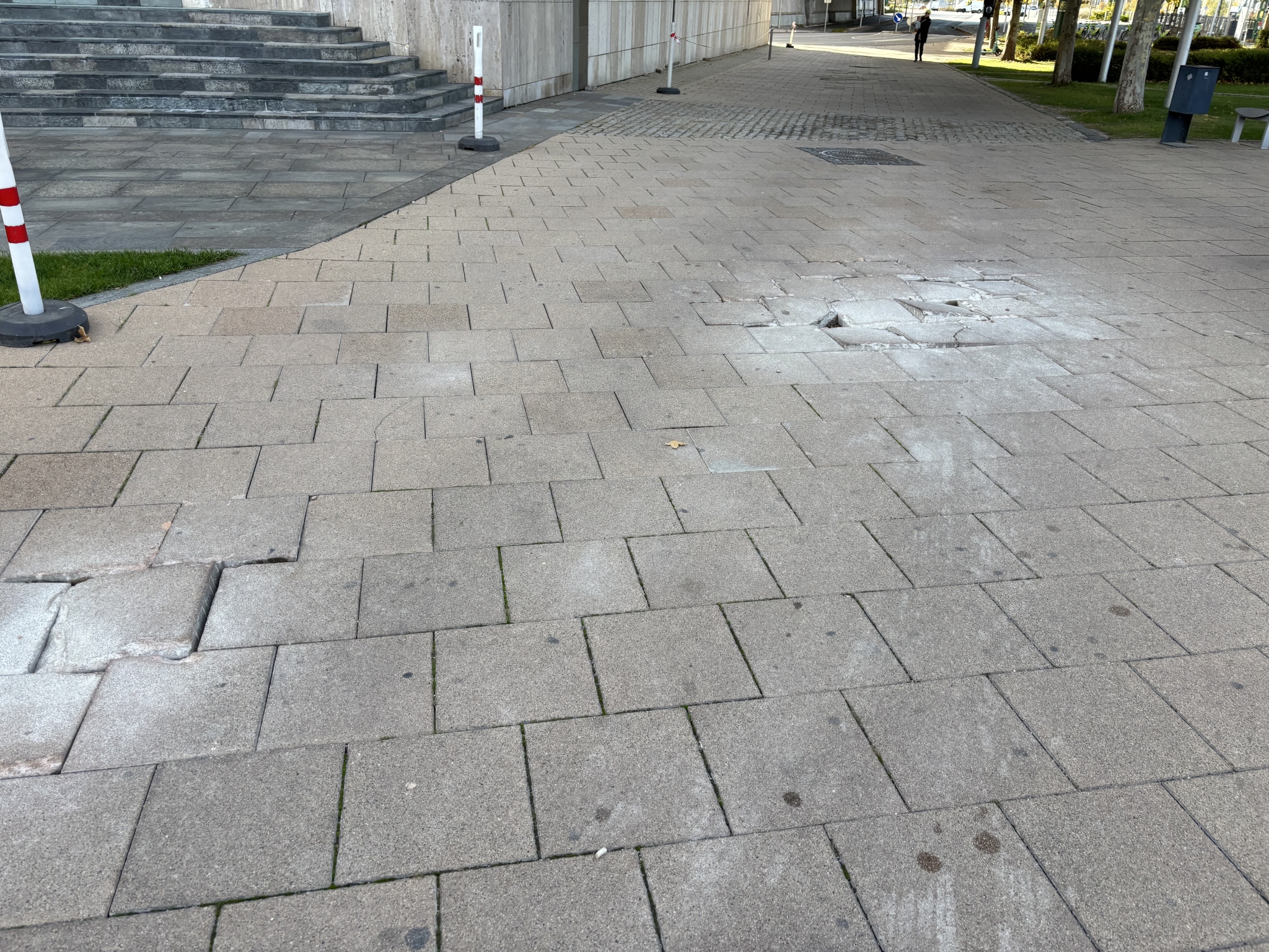 A MÜPA mellett több helyen is megsüllyedt és balesetveszélyes állapotú a térkövezés már évek óta. Folyamatosan növekszik a gödrök száma és mérete.