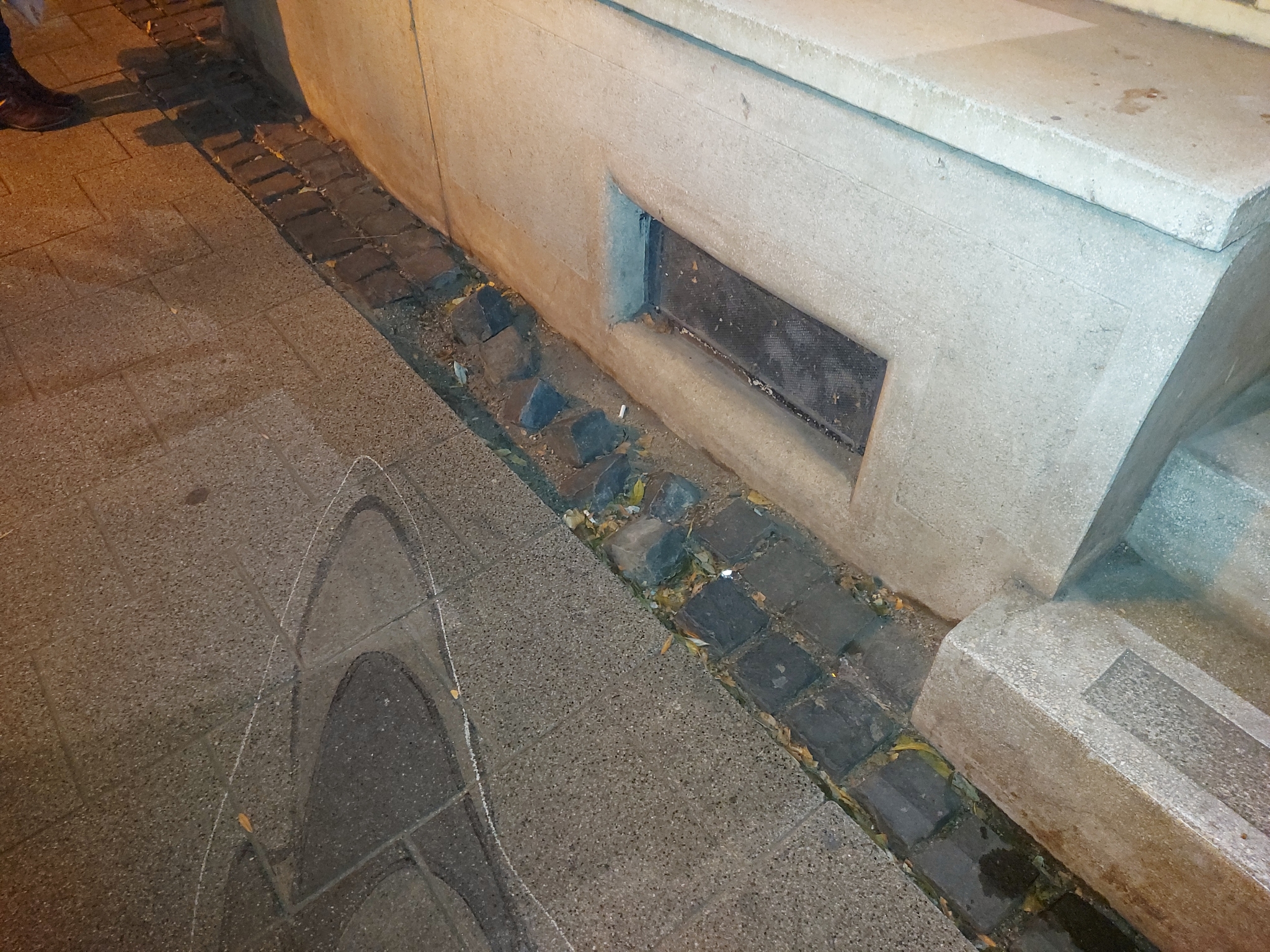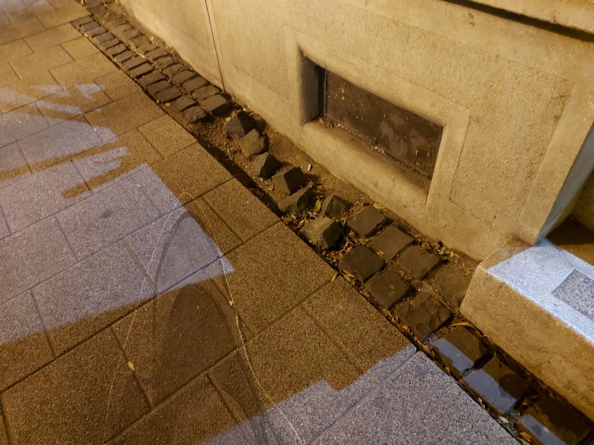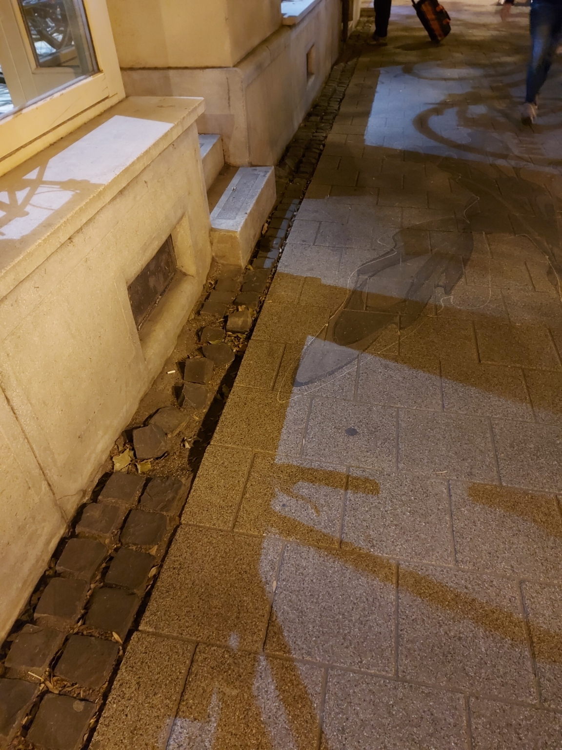 A Bartók Béla út járdájának ház melletti macskaköves része teljesen szétesett.