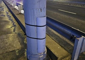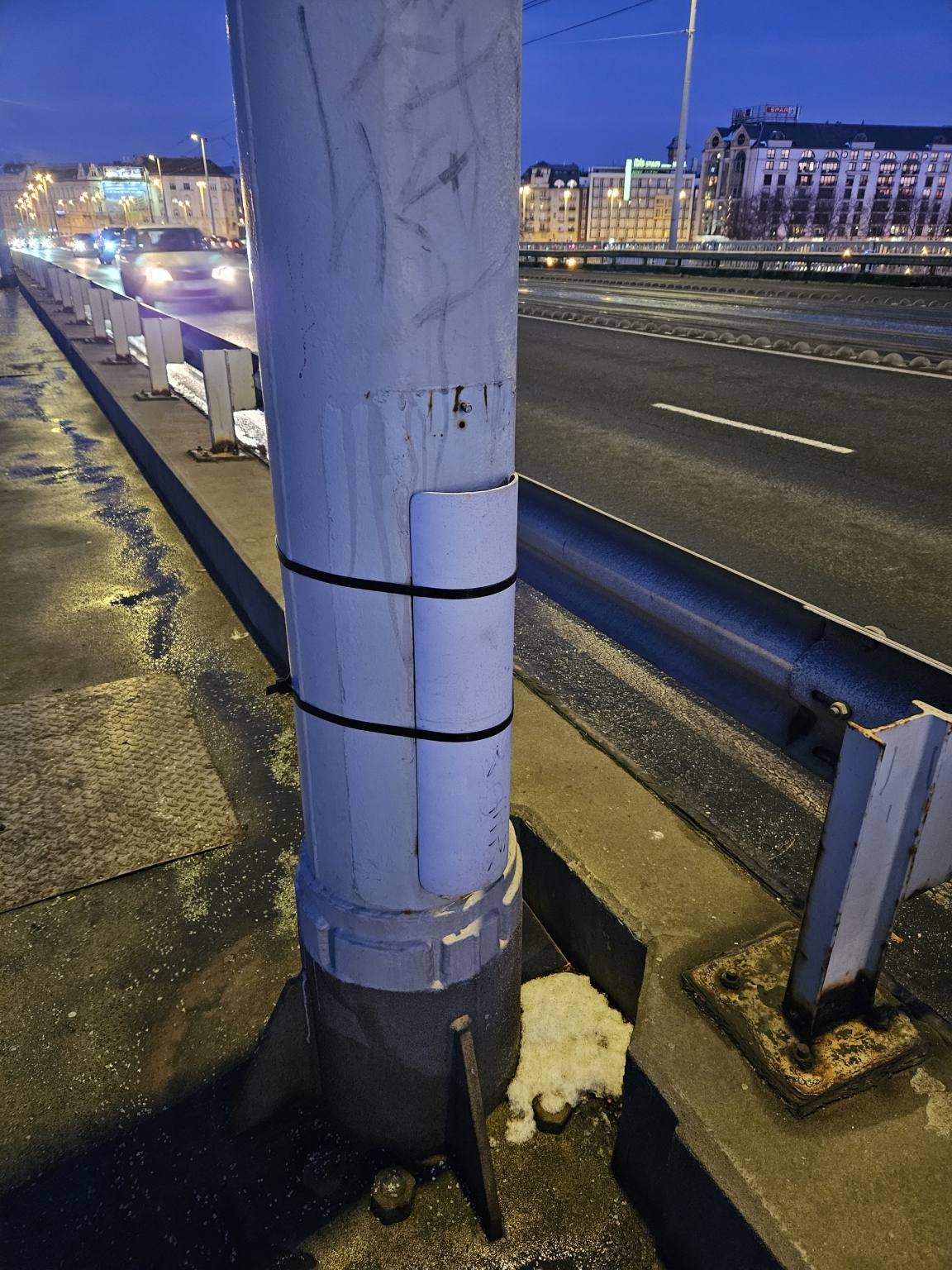 Hiányzik a lámpaoszlop fedele a Petőfi hídon északi oldalon.