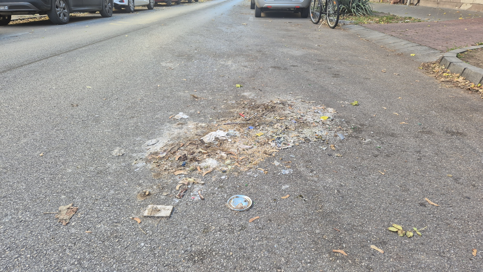 A https://jarokelo.hu/bejelentesek/budapest/152573/kihullo-szemet-sokadik-felvonas bejelentéshez hasonlóan újra üvegcseréppel megspékelt szemétkupacok kísérték a szemétgyűjtő autót. A képek 2 nappal ezelőttiek (október 28), többet is készíthettem volna mert az utca szinte teljes hosszán, minden megállás során hasonló szépségek keletkeztek.