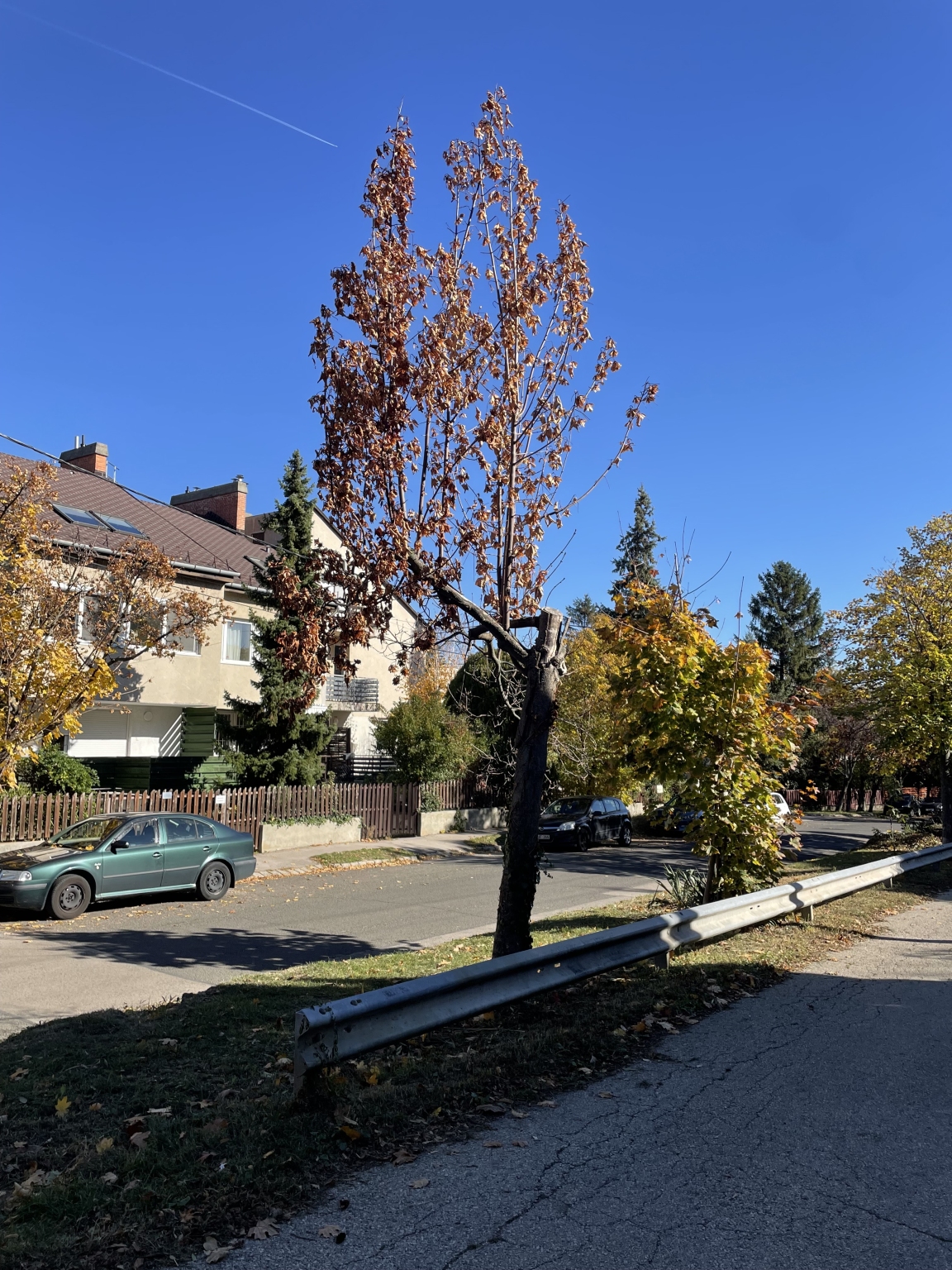 A Beregszasz utca középső szakaszán van egy kiszáradt fa, ami tavasz óta nem került kivágásra.