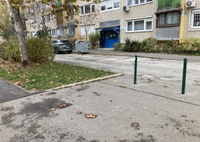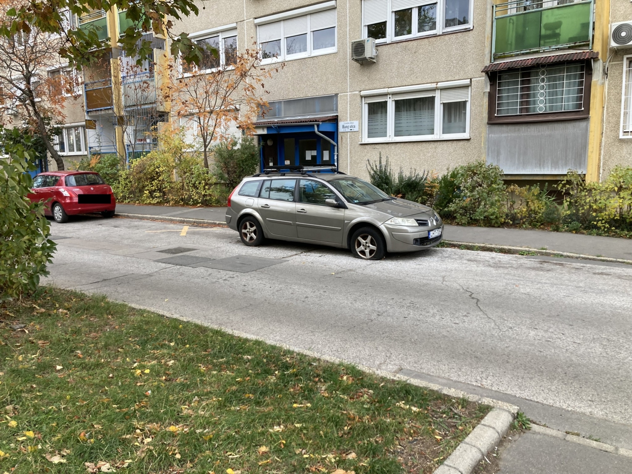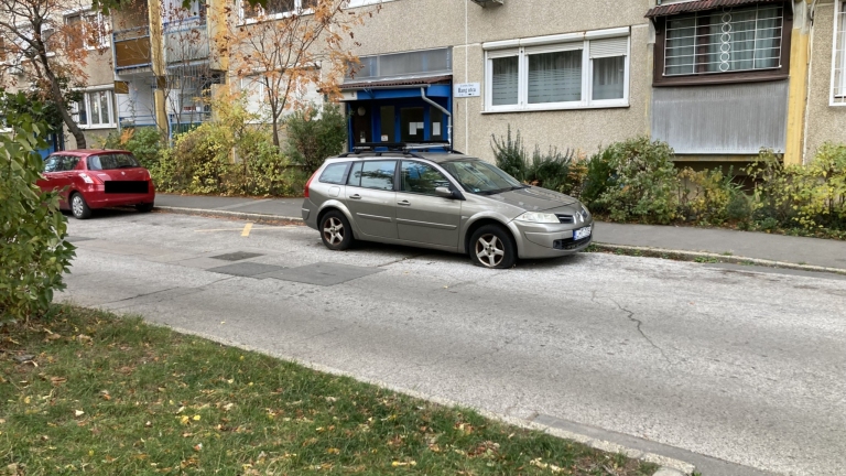 Elhagyott autó áll a Hang utcában, leeresztett, rozsdás kerekekkel.