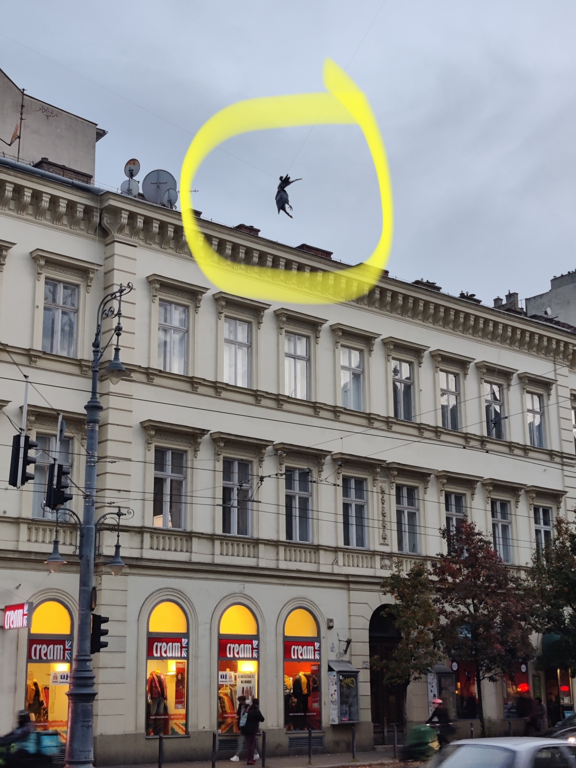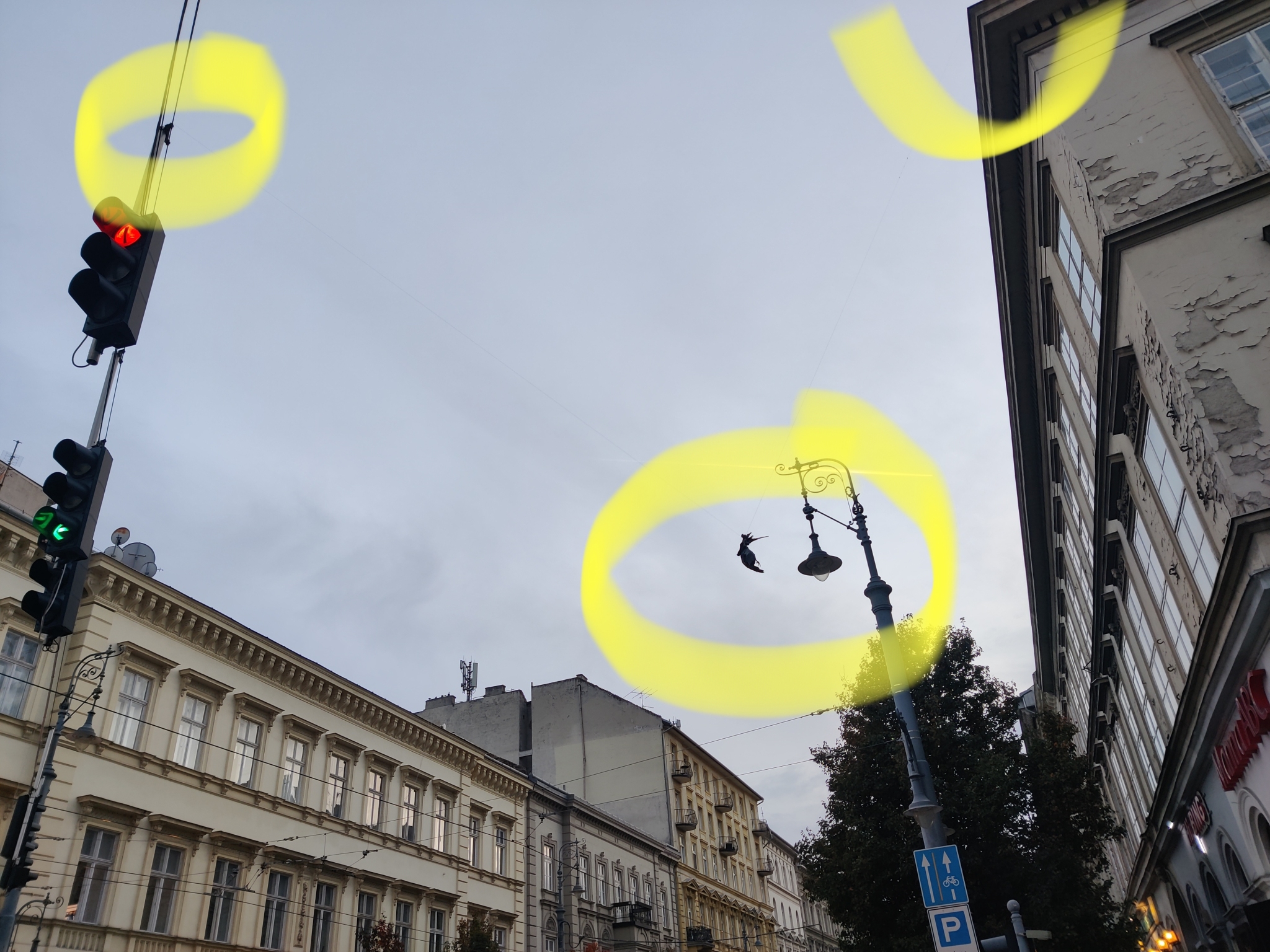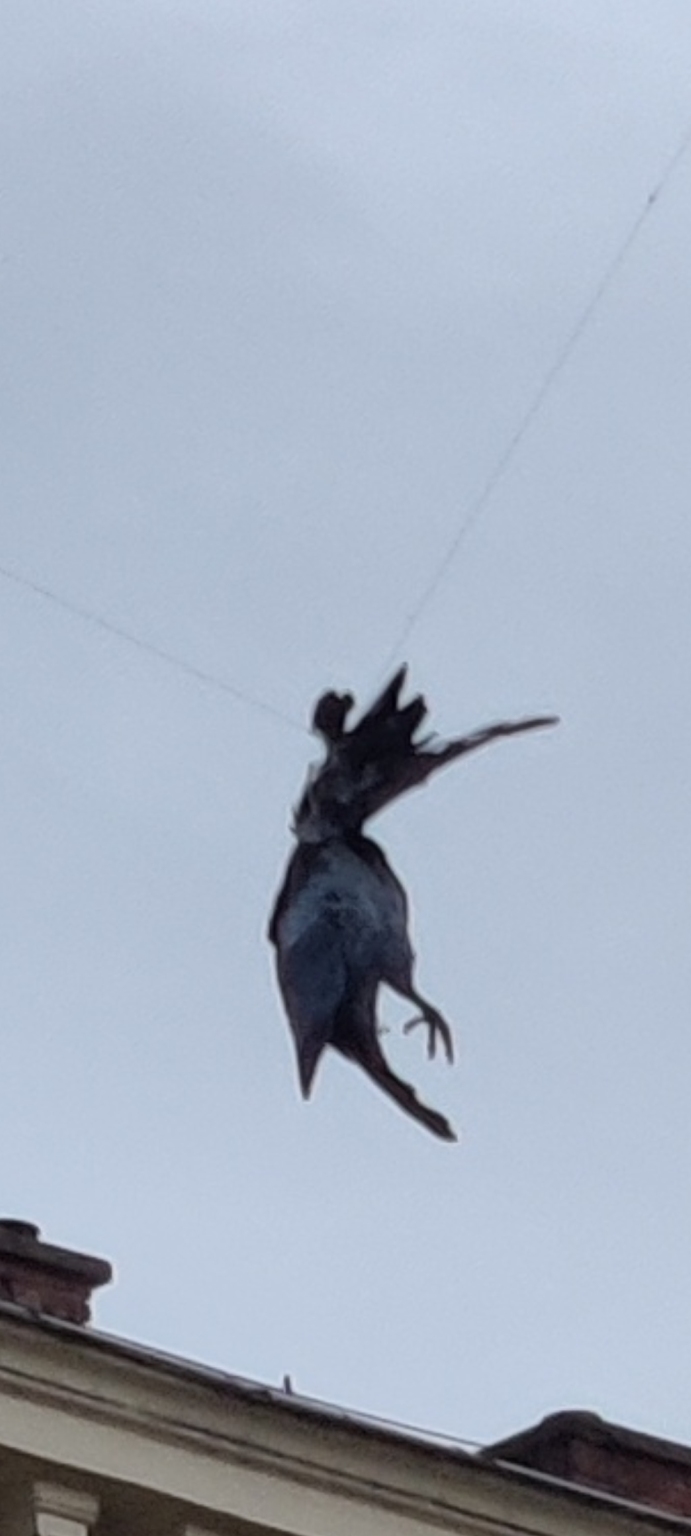 Budapesten a Kálvin tér mellett a Királyi Pál utca végén a zebra felett egy a Manna ABC épületének a teteje és a közúti lámpa közé kihúzott majd ottfelejtett damil aprítja az arra repülő galambokat. Szükséges lenne azonnal levágni onnan.