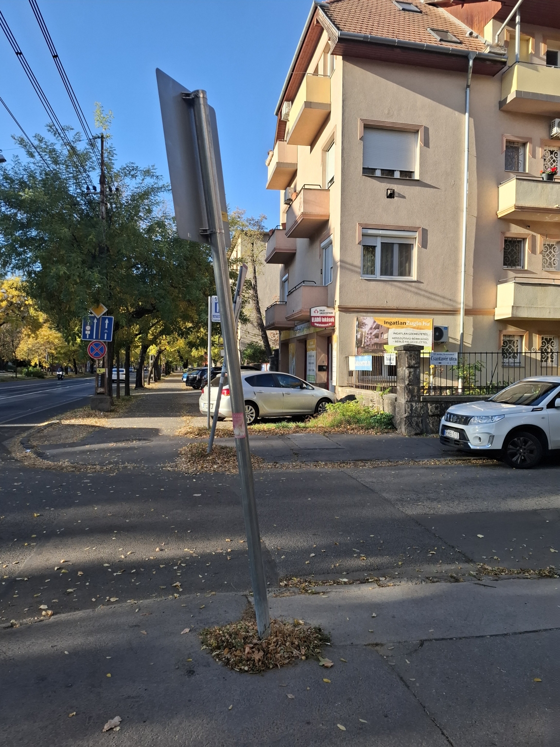 A Csantavér utca és a Thököly kereszteződésében két közlekedési tábla is meg van dőlve, az egyik az úttest felé. Kérem állítsák helyre, lehetőleg úgy, hogy a szemetes autó kiforsuláskor ne akadjon bele.