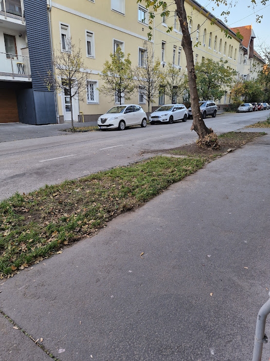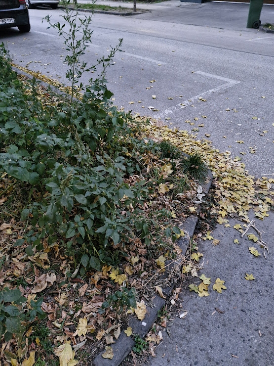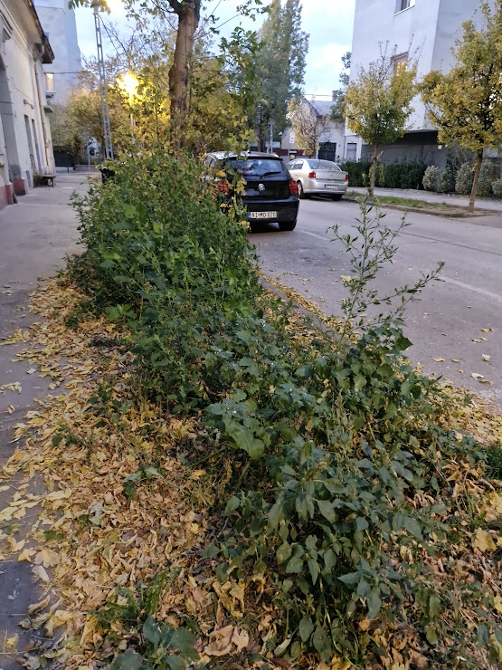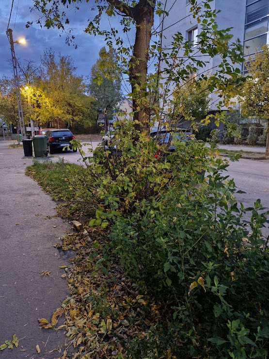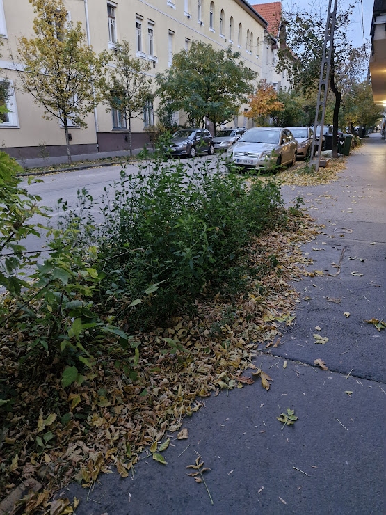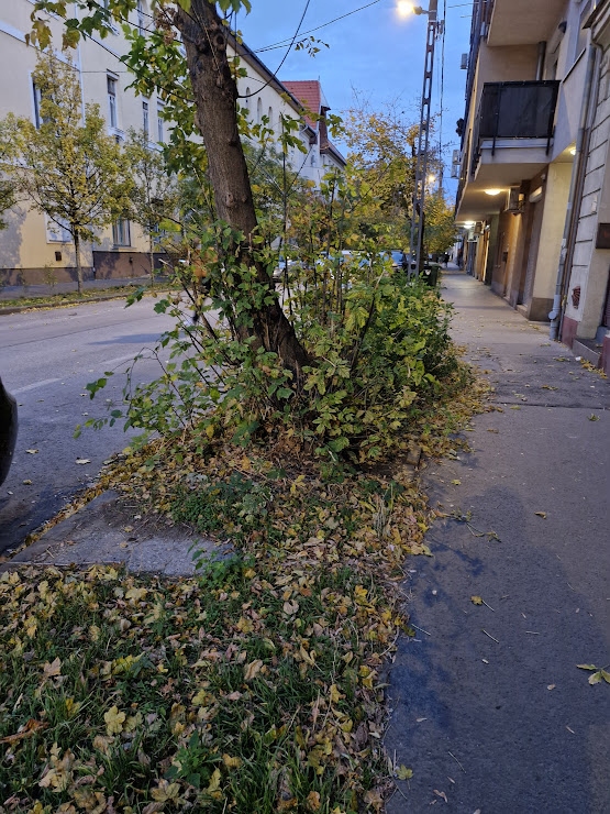 Angol utca 50 előtti utcafronton nyakig ér a gaz. igénytelen, gondozatlan. A fa sarjas.