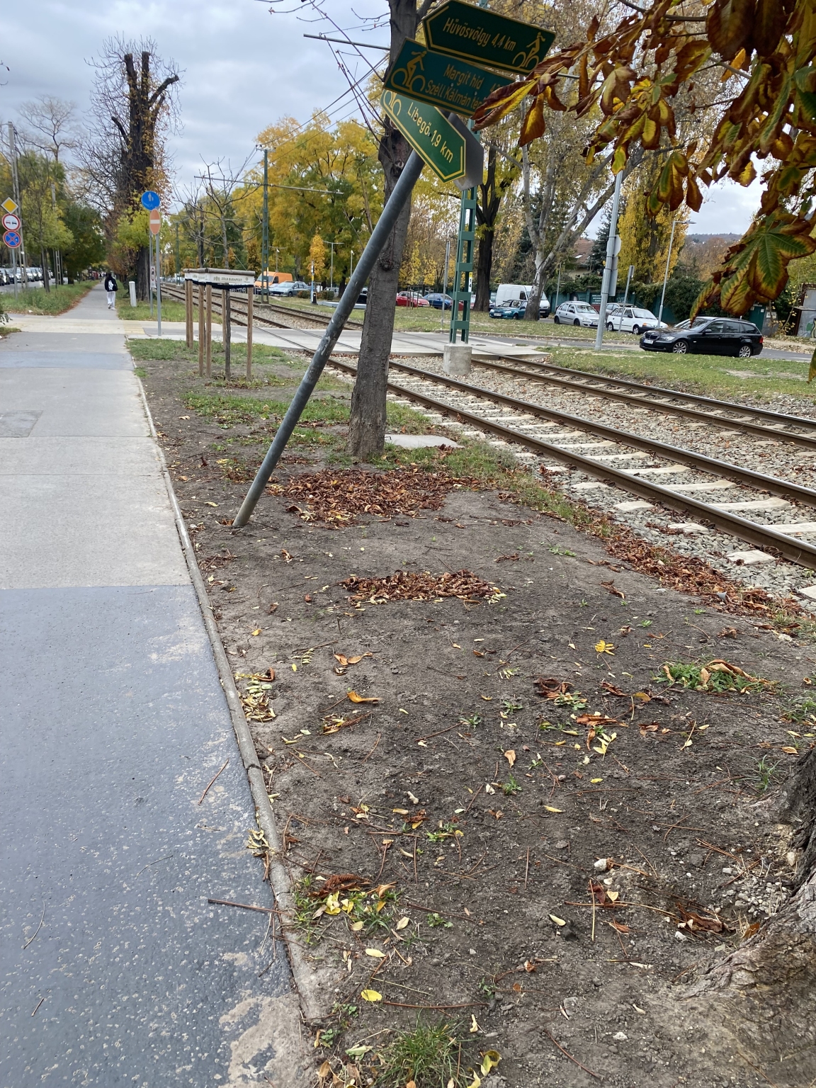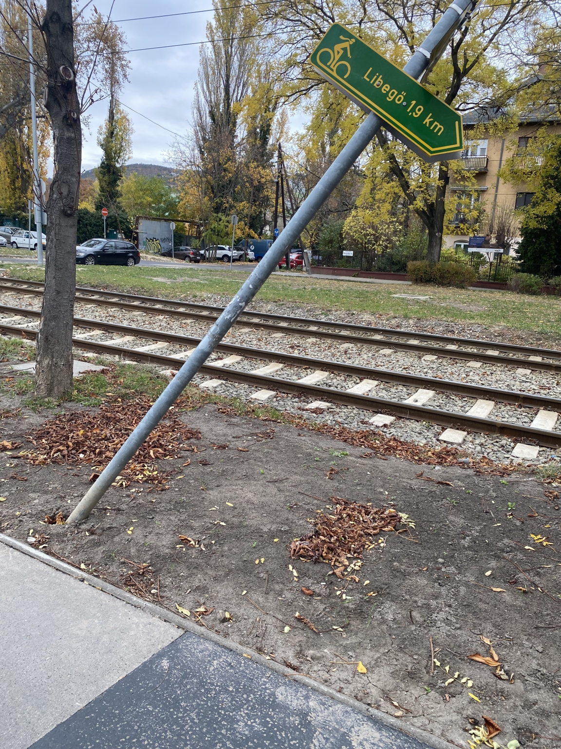 A Hűvösvölgyi út és a Budakeszi út találkozásánál a zebránál lévő közlekedési tábla erősen megdőlt, bármikor kidőlhet. Kérem, mielőbbi intézkedésüket a balesetveszély elhárítása érdekében.