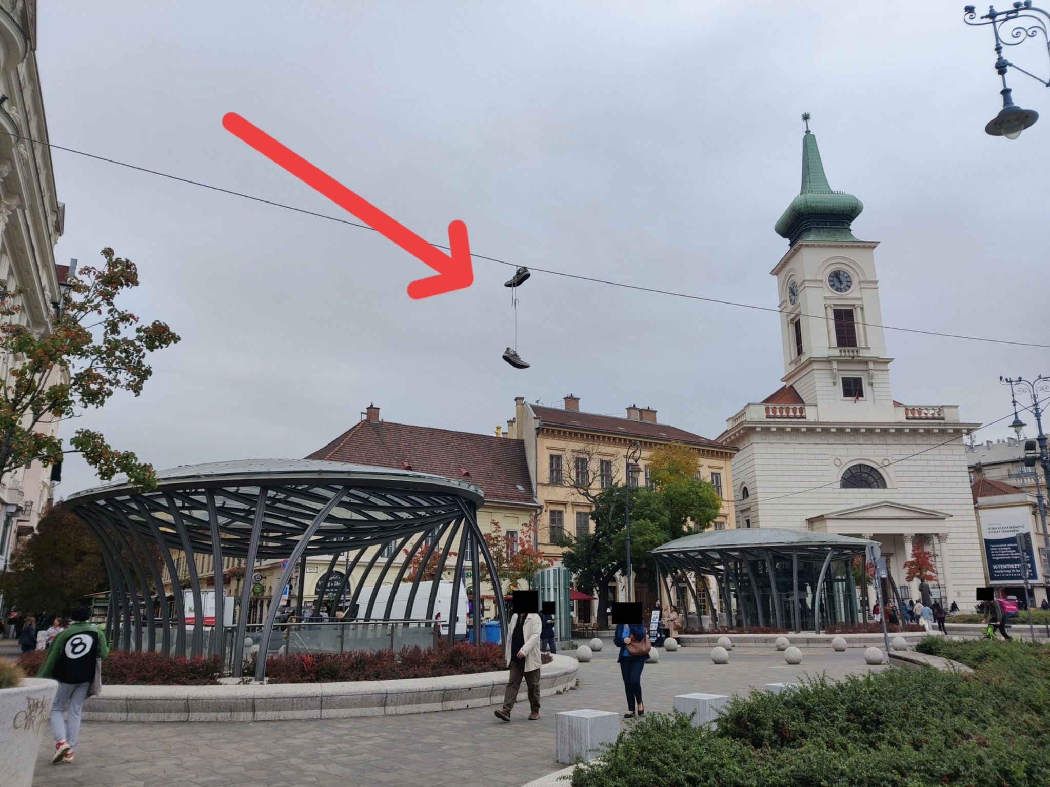Budapesten a Kálvin téren két helyen is összekötött sportcipők lógnak a légvezetékeken.