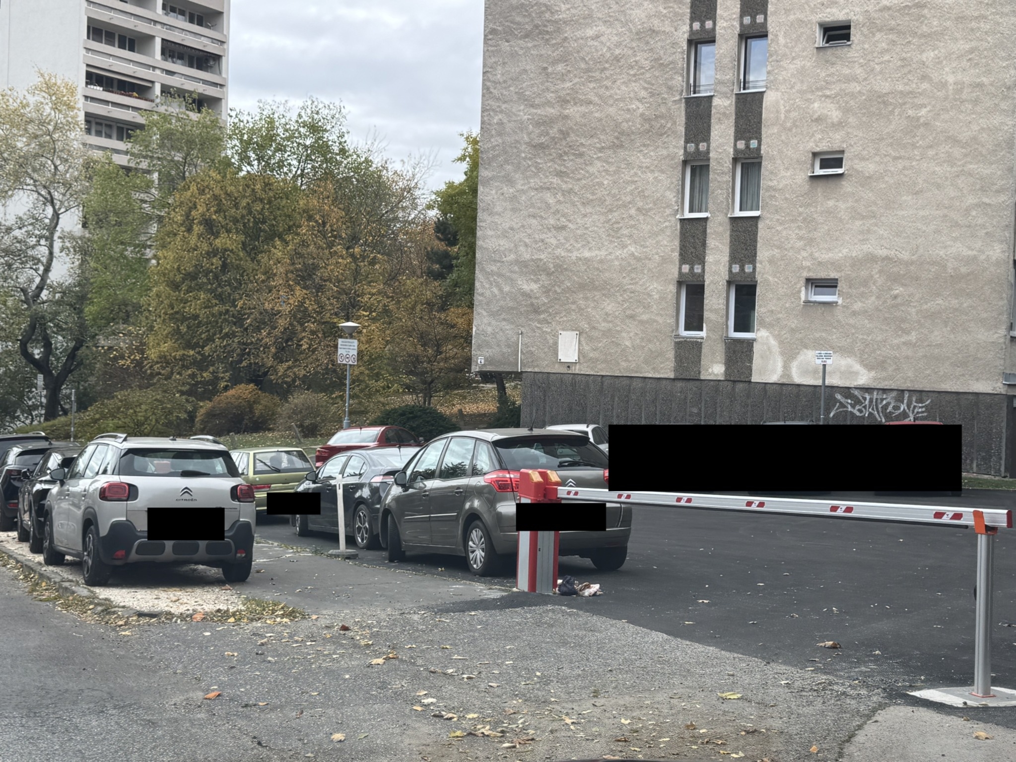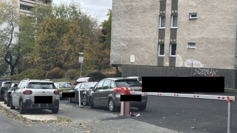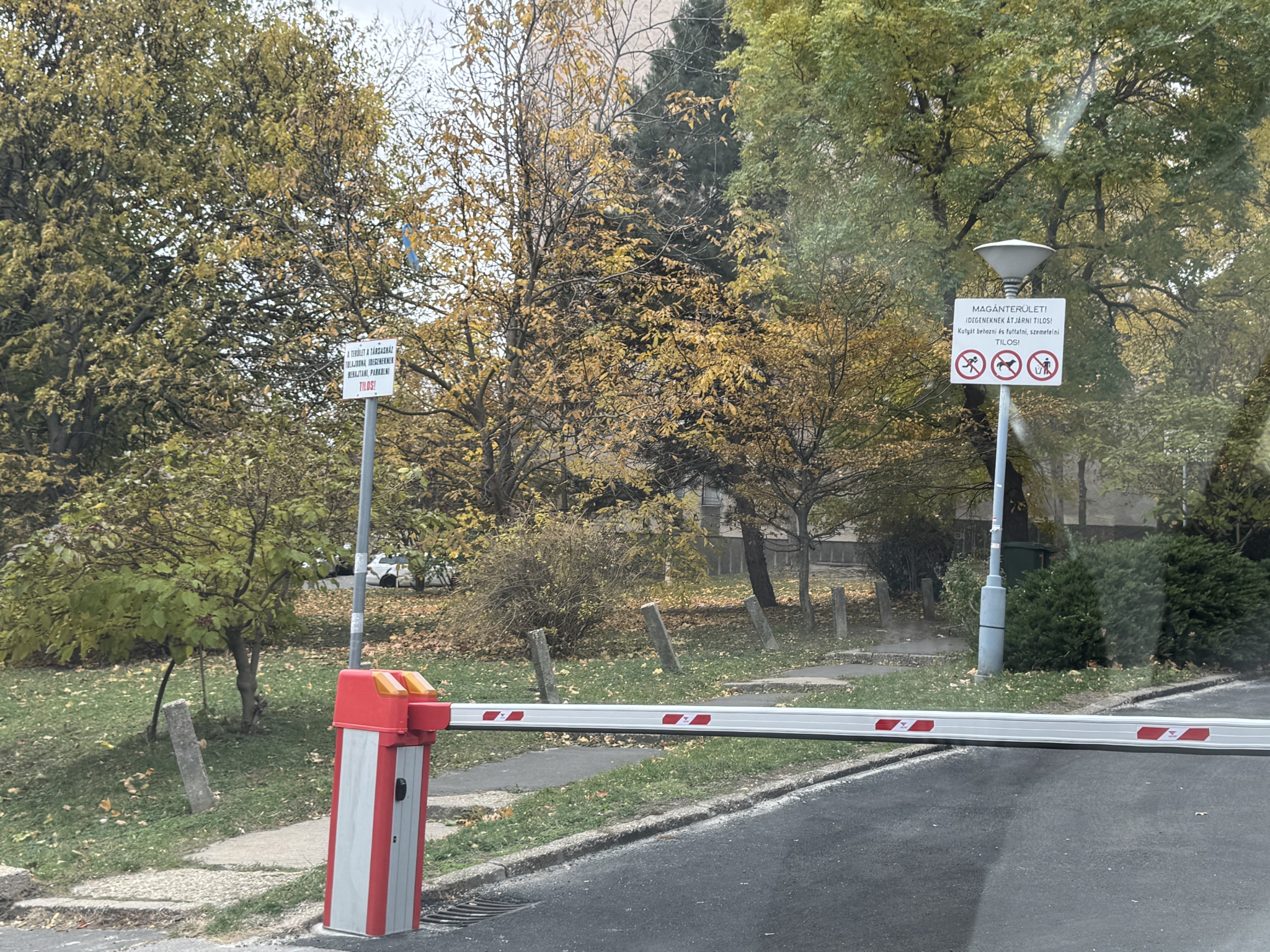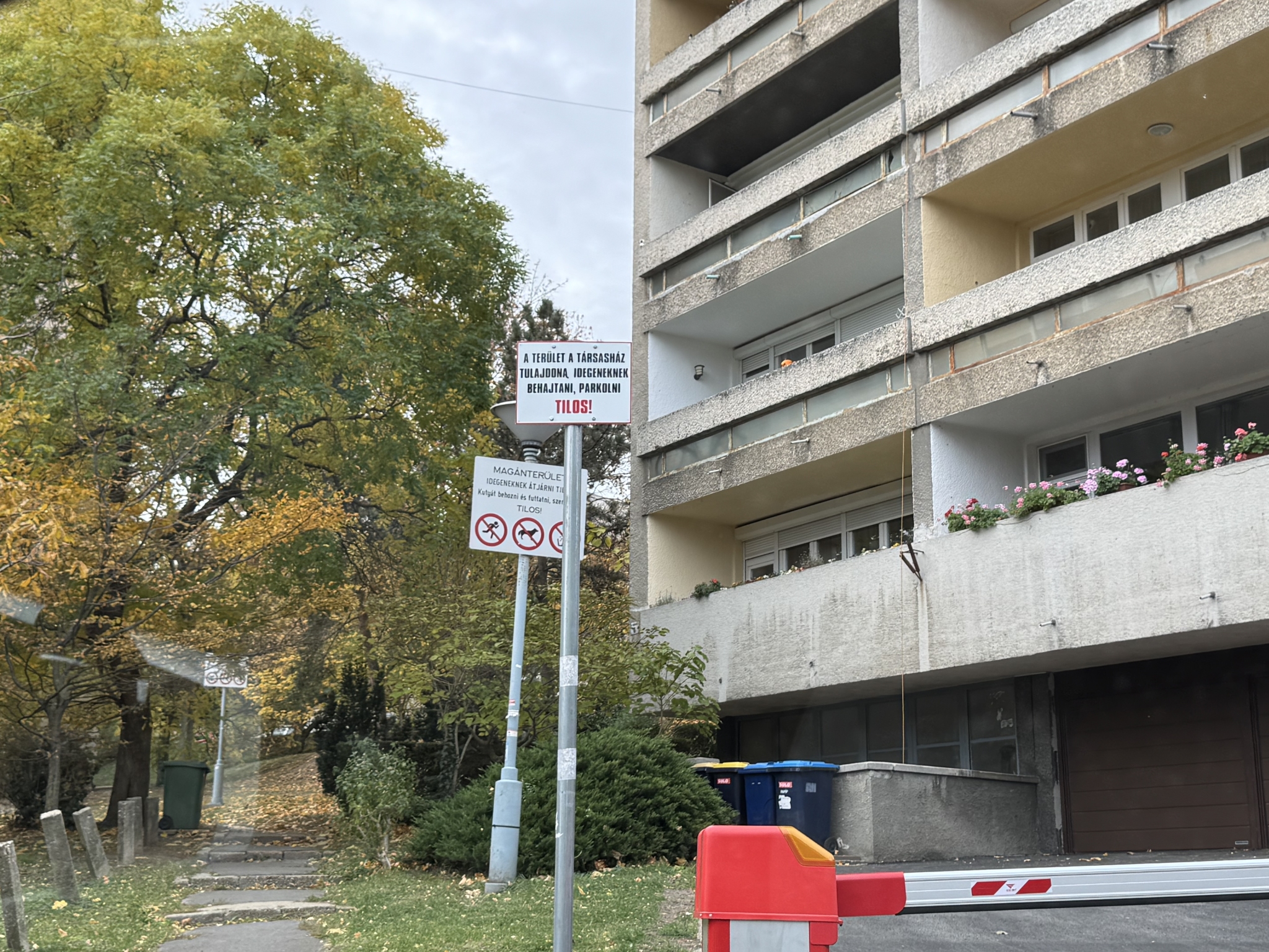 A Thomán István 6 sz előtti aszfaltozott területet/parkolót sorompókkal zárták le.