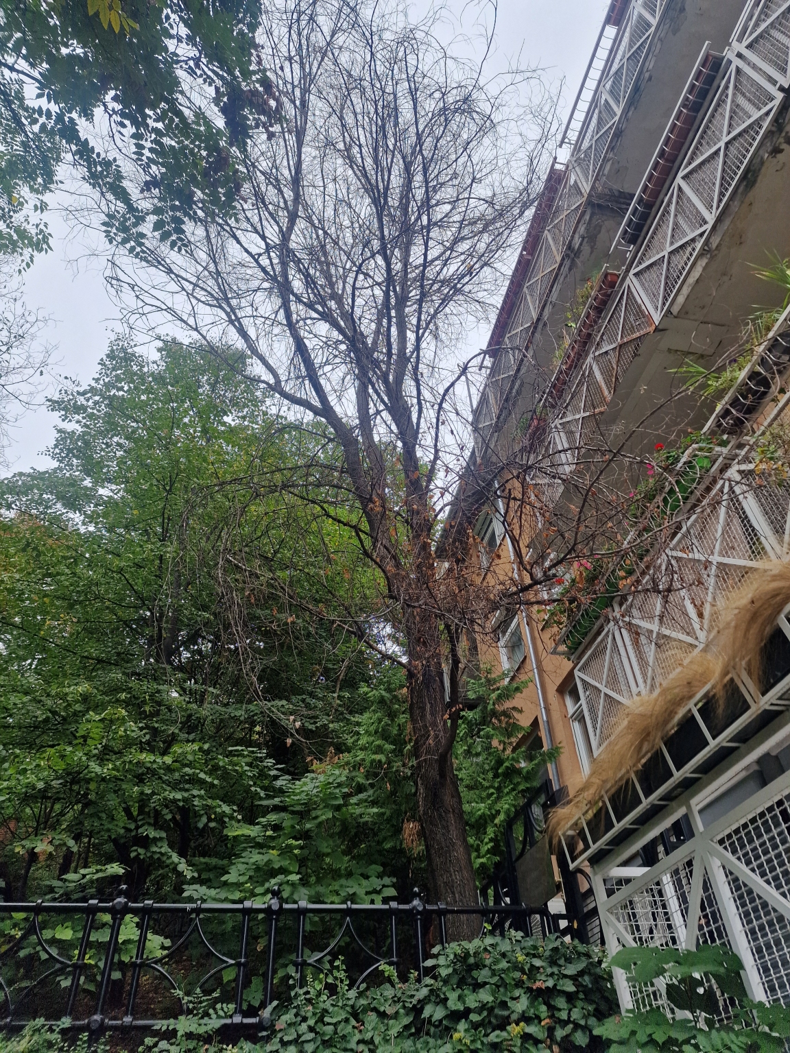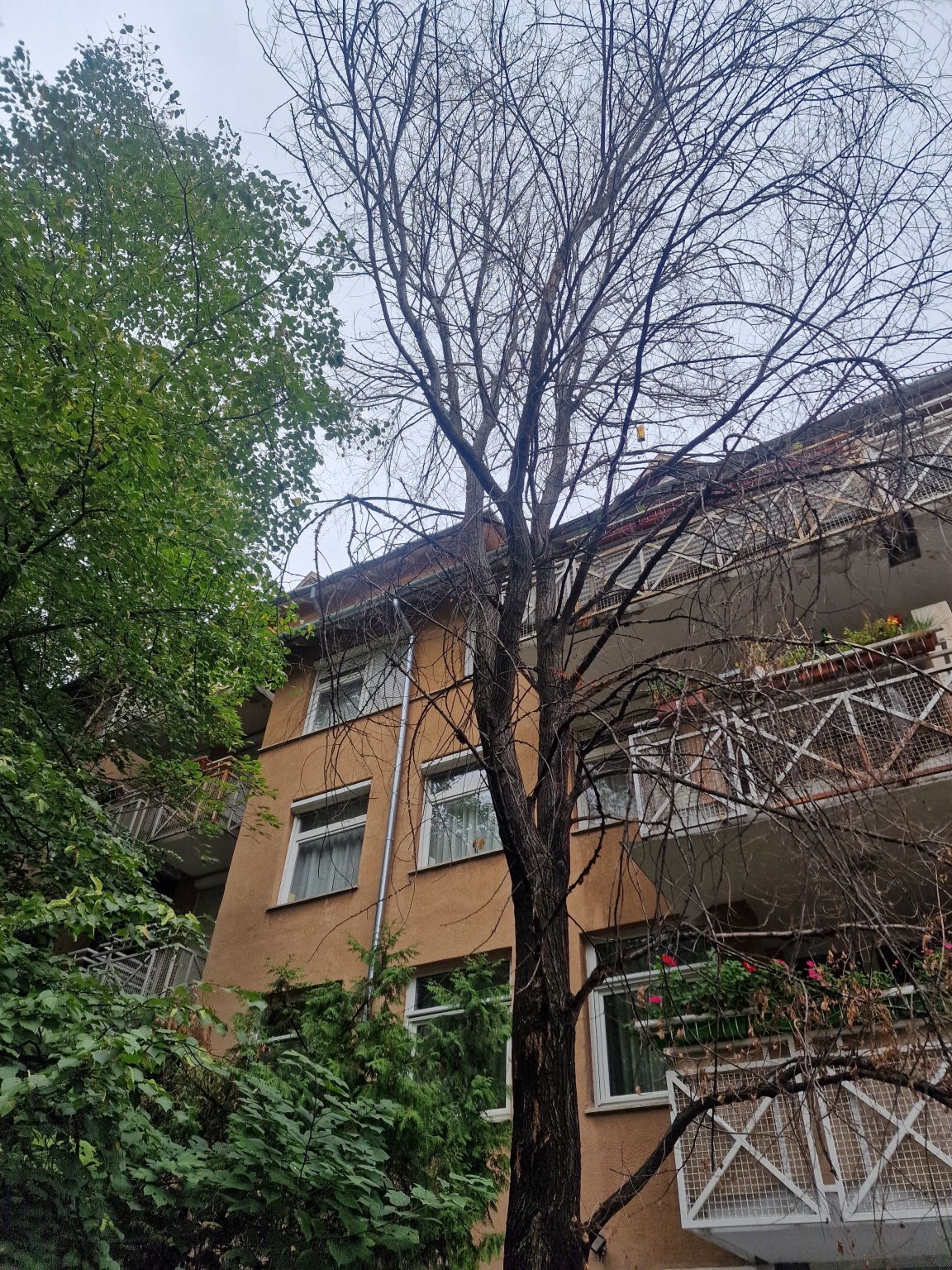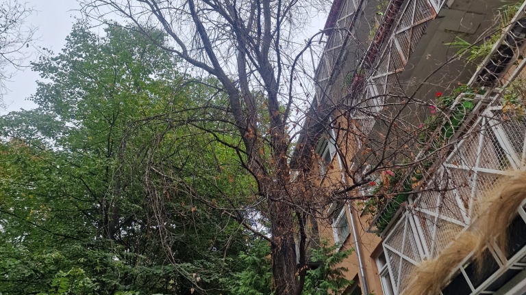 A fa évek óta halott, ki kellene vágni. A Gránit lépcső mellett, a Tábor u. 5. társasház Gránit lépcső felöli fogorvosi rendelő bejáratánál, a kerítésen kívül, az utcán.