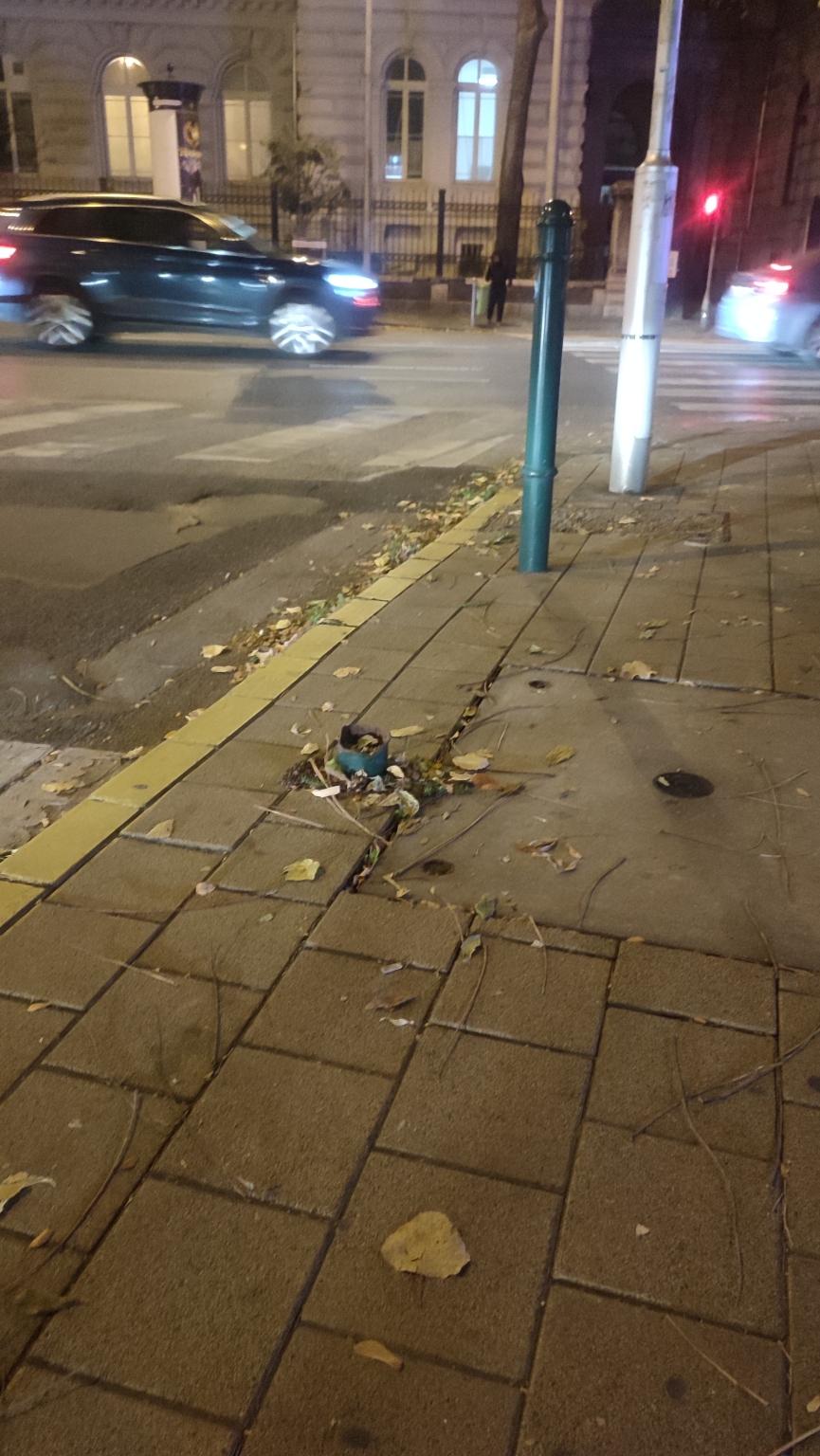 A Köztelek-Üllői sarkon kiáll a járdából egy kitört/elrozsdált oszlopcsonk.