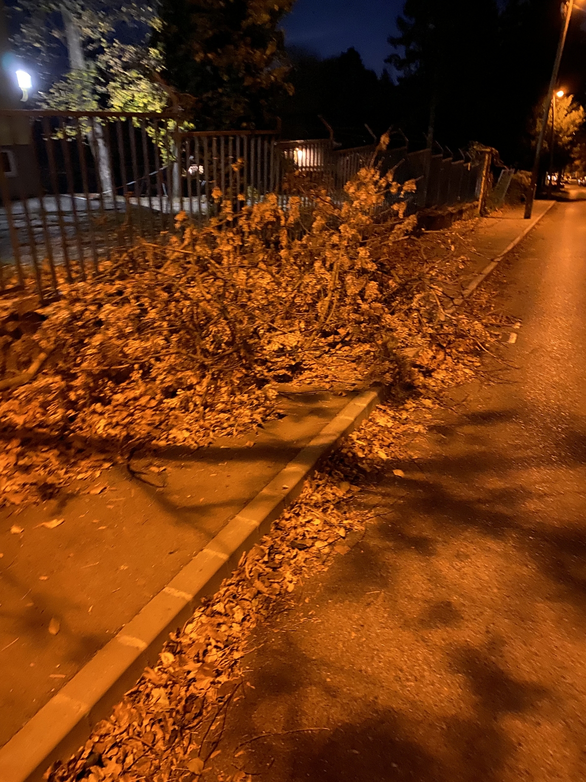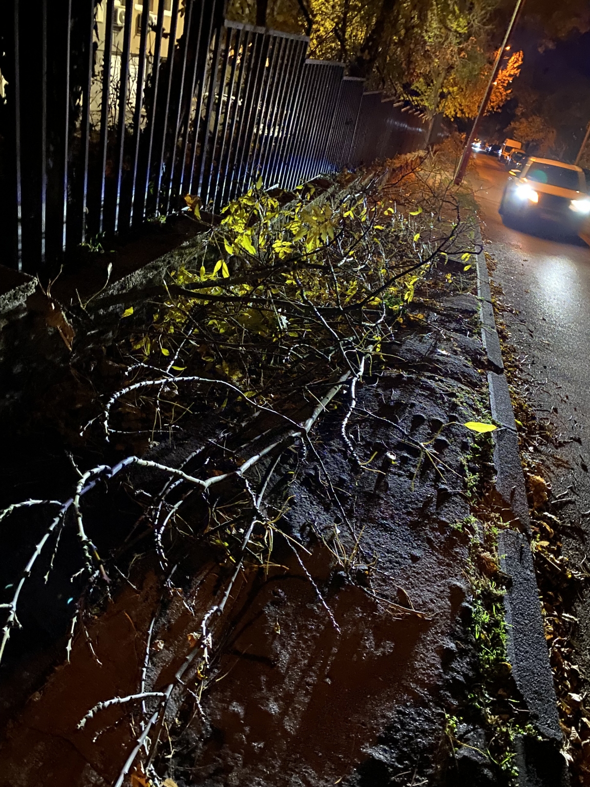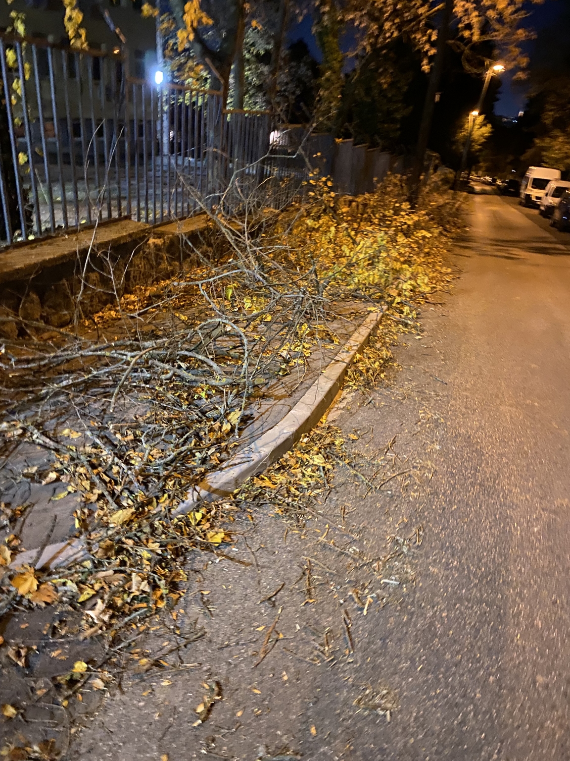 A Tárogató úton egy hosszabb szakaszon a járda nagy méretű, letört faágakkal teljesen el van torlaszolva, így a gyalogos közlekedés nem biztosított.