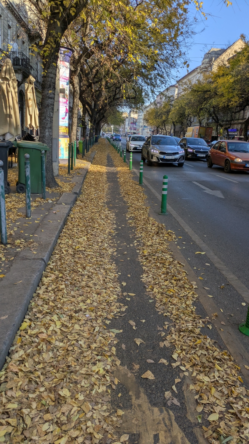 Ferencz körúti kerékpár sávba mind a két oldalon a elárasztották a fákról lehulló levelek, van olyan szakasz, ahol már a sáv több mint fele nem használható a levelek miatt. Egy nagyobb eső után nagyon balesetveszélyes lesz itt közlekedni.