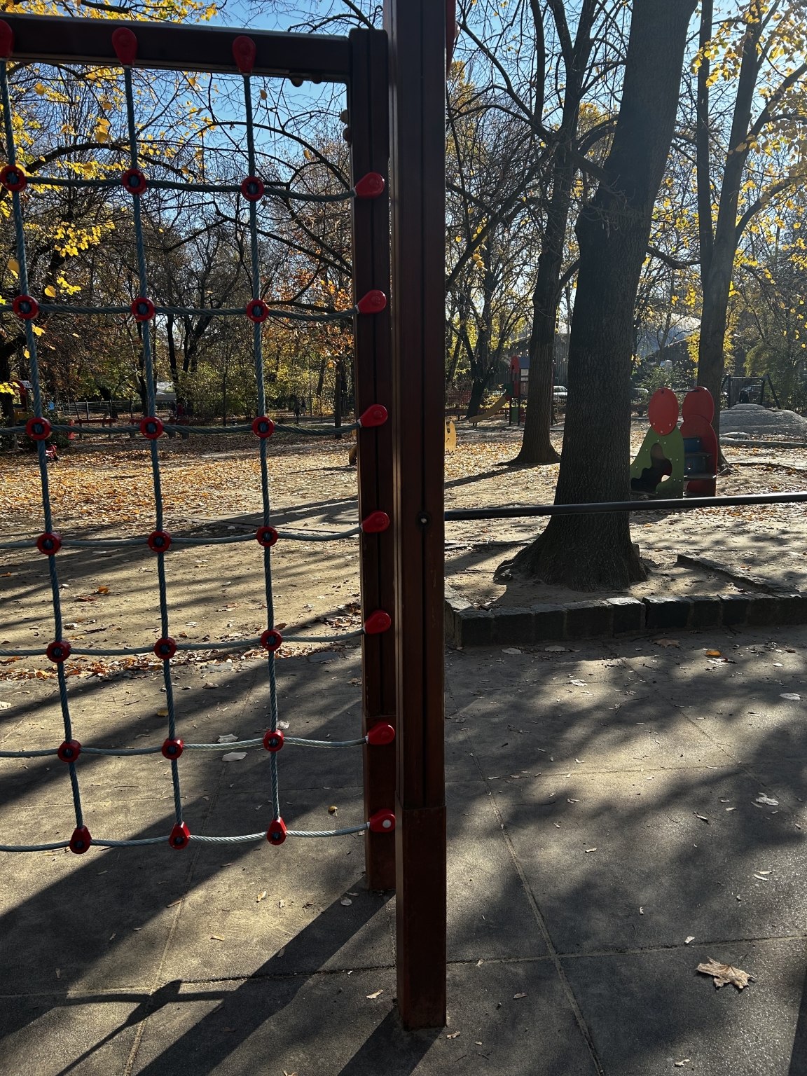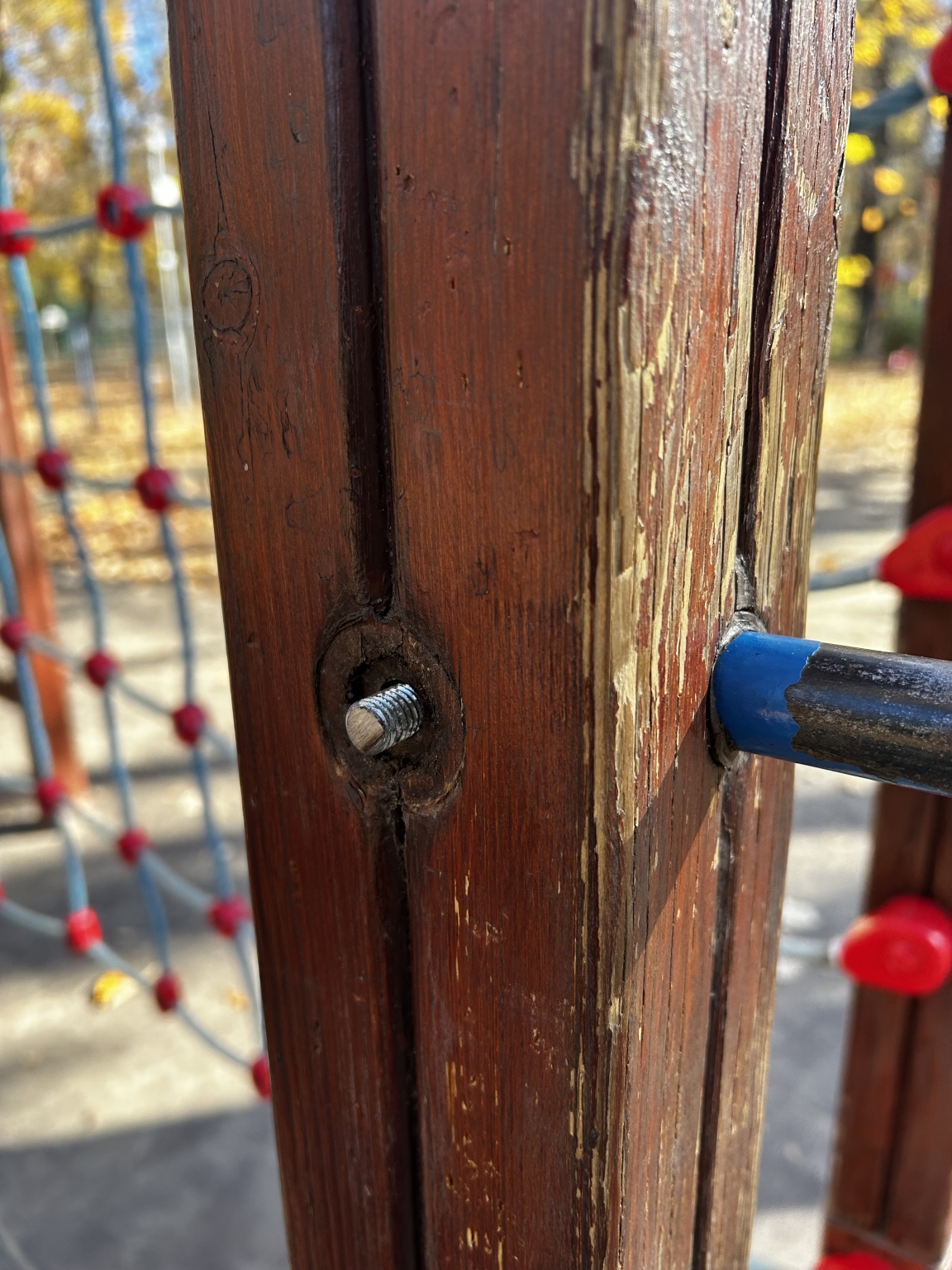 A Városmajori játszótéren a mászókán lévő csavarról lejött a védőburkolat. Egy gyermek már meg is sérült emiatt, elvágta a kezét a csavar kiálló része.