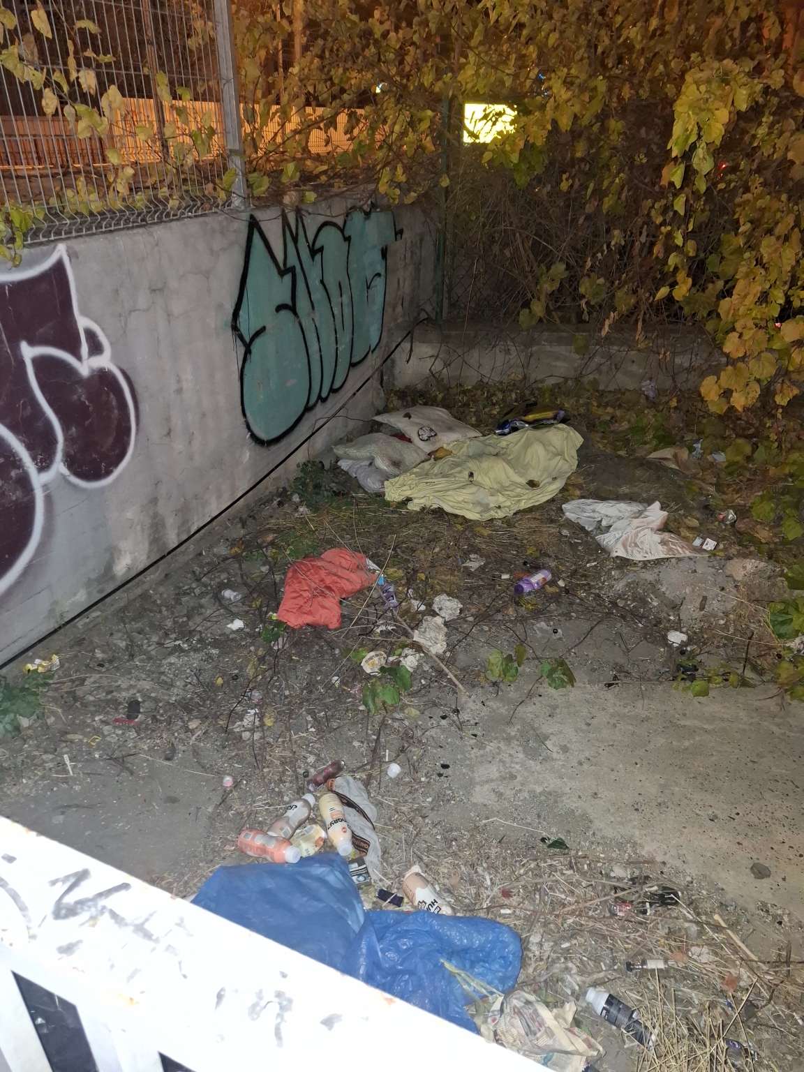 A szemét a felüljáró mellett/alatt szét van dobálva.