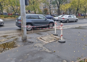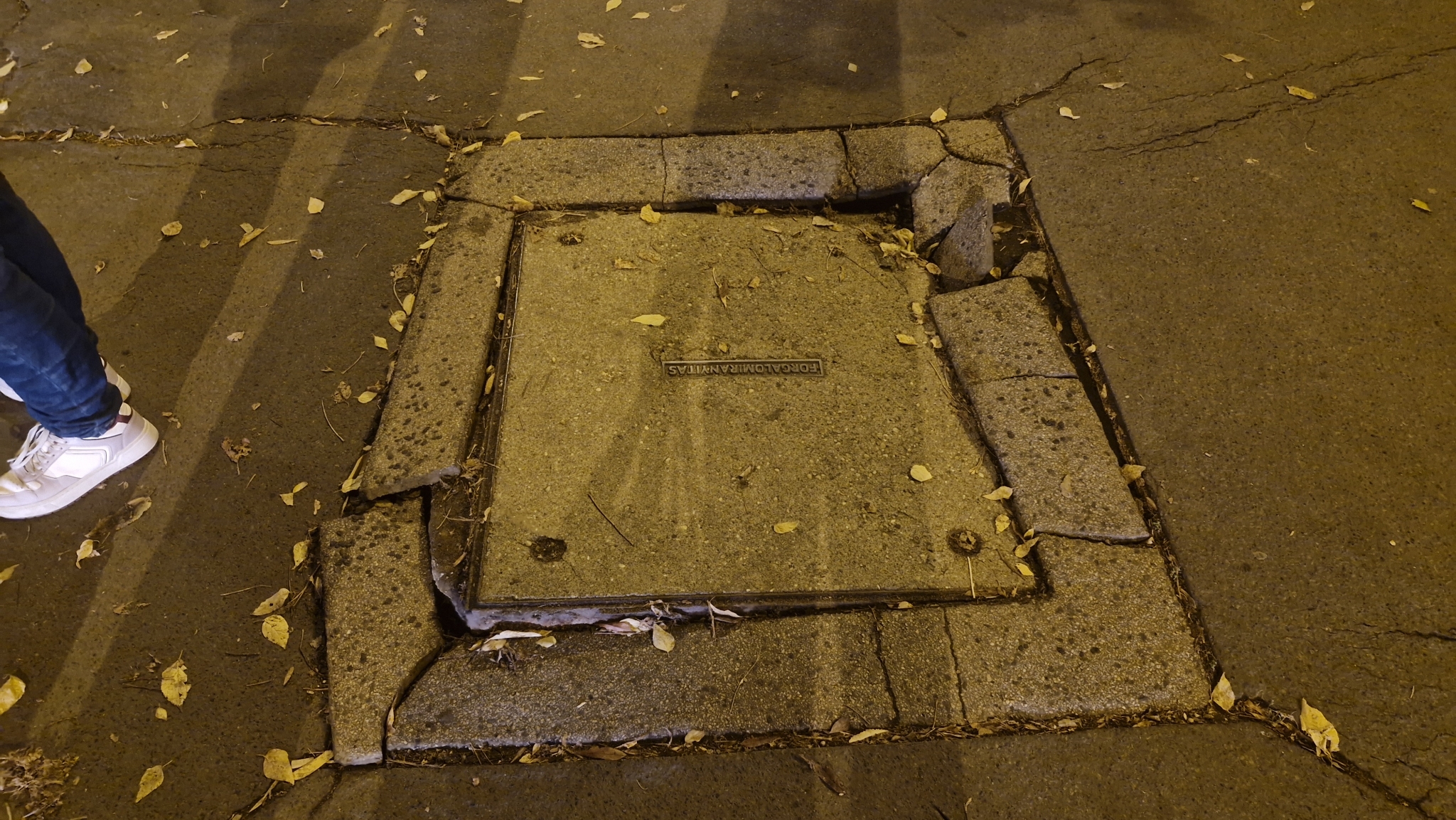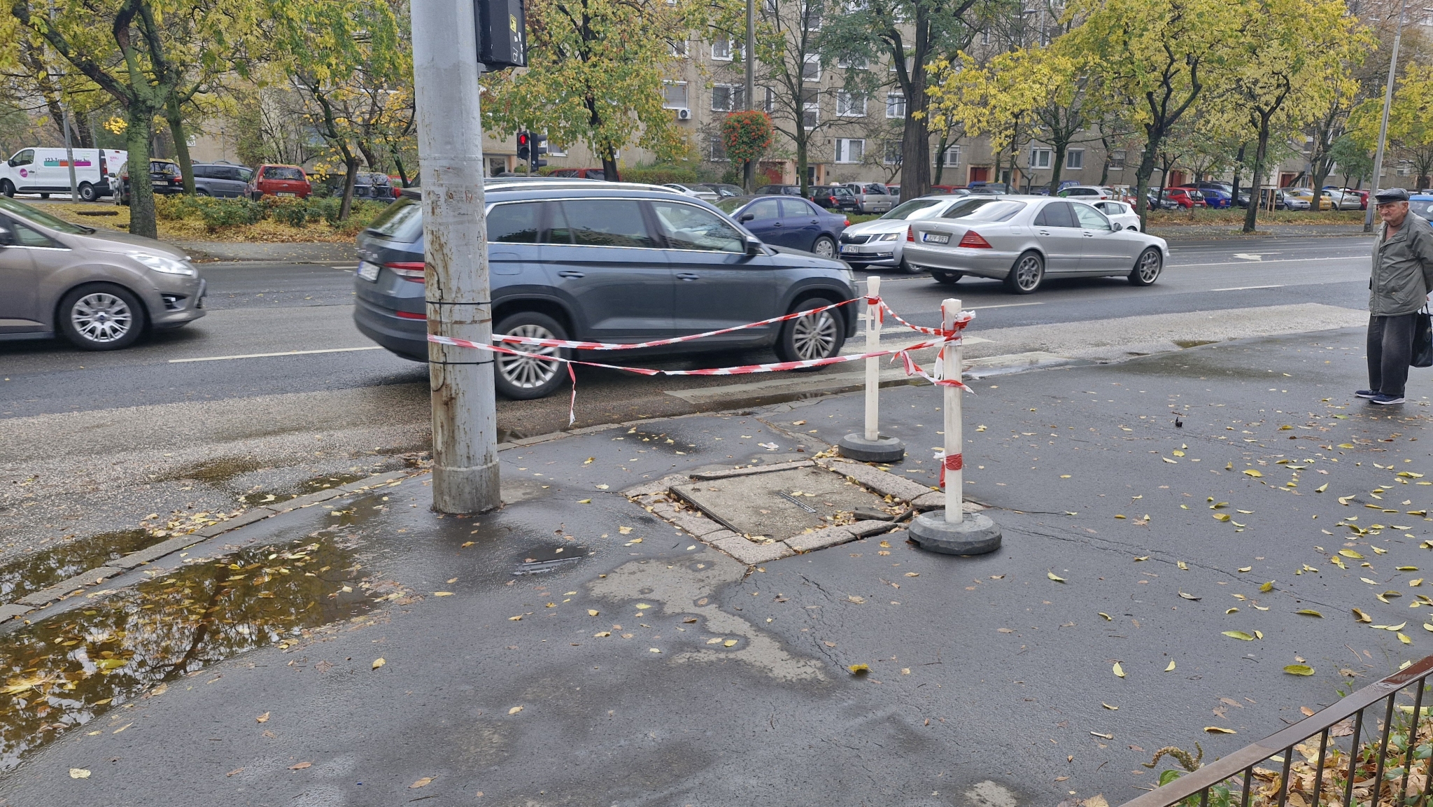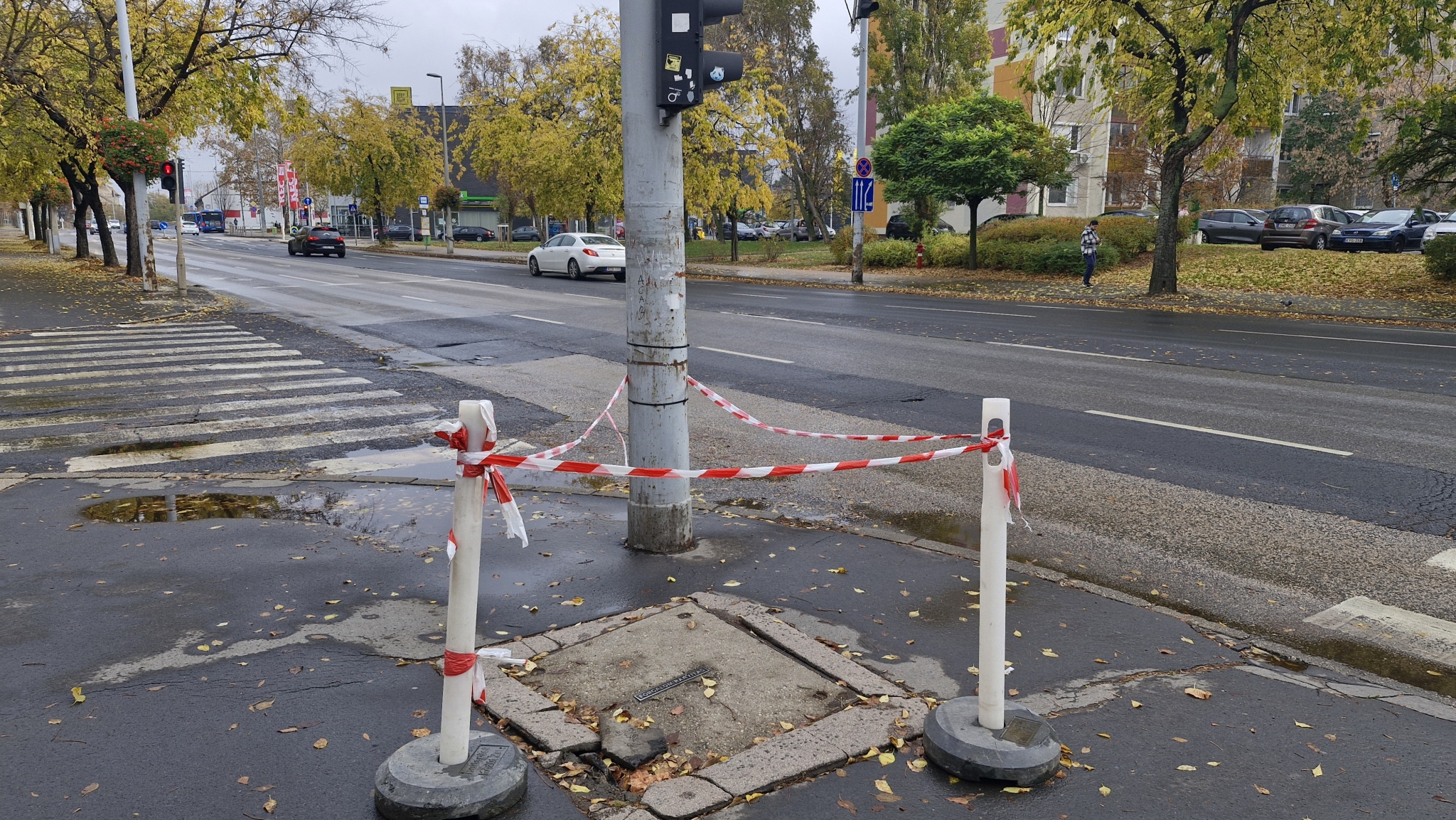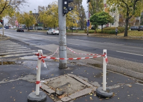 Egy forgalomírányitási aknafedélnek a széle megsülyedt és baleset veszélyes lett a hely