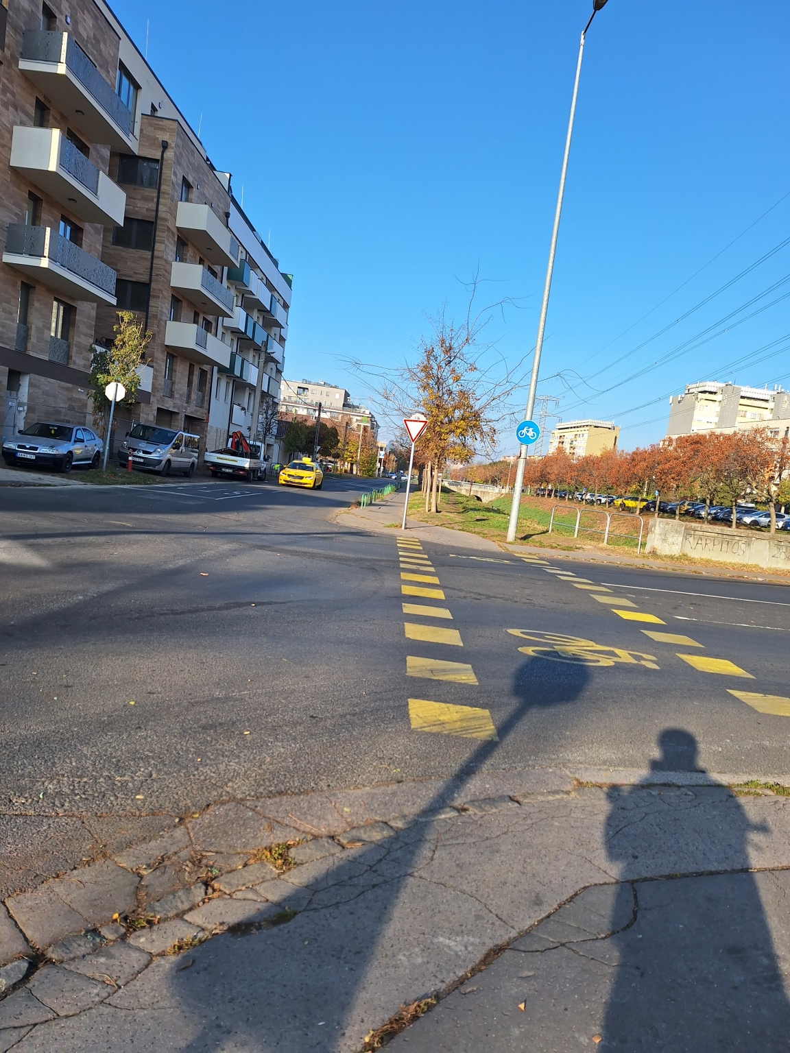 180 fokkal el van fordítva az elsőbségadás tábla a kerékpárút kezdete táblával együtt.