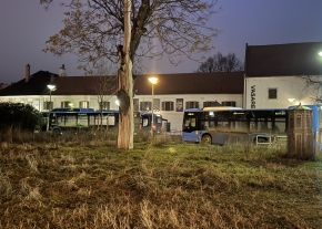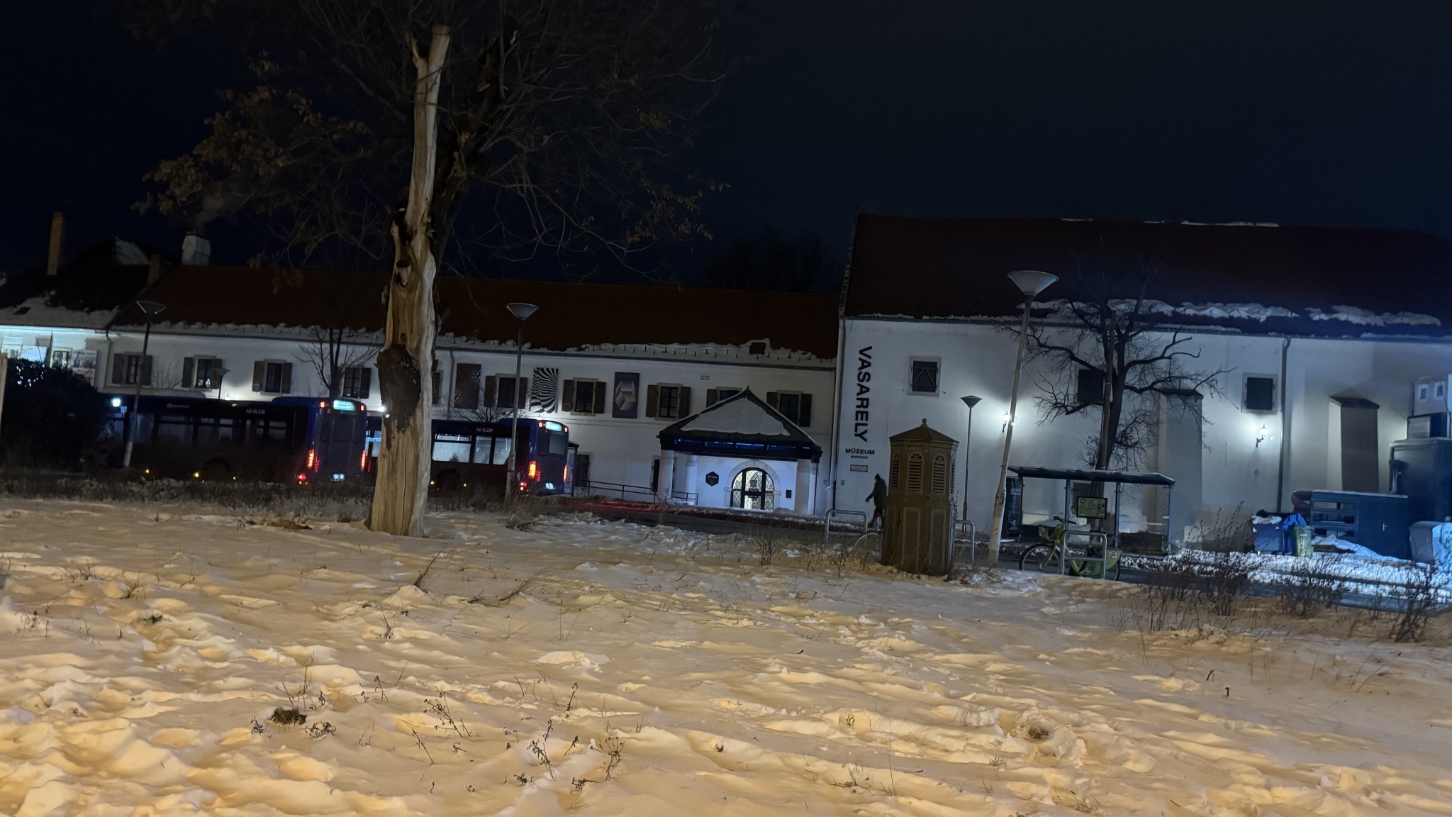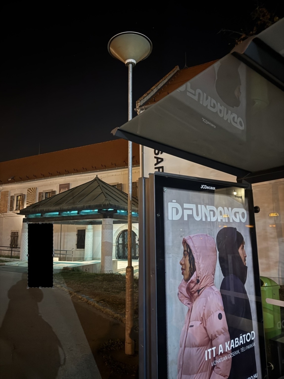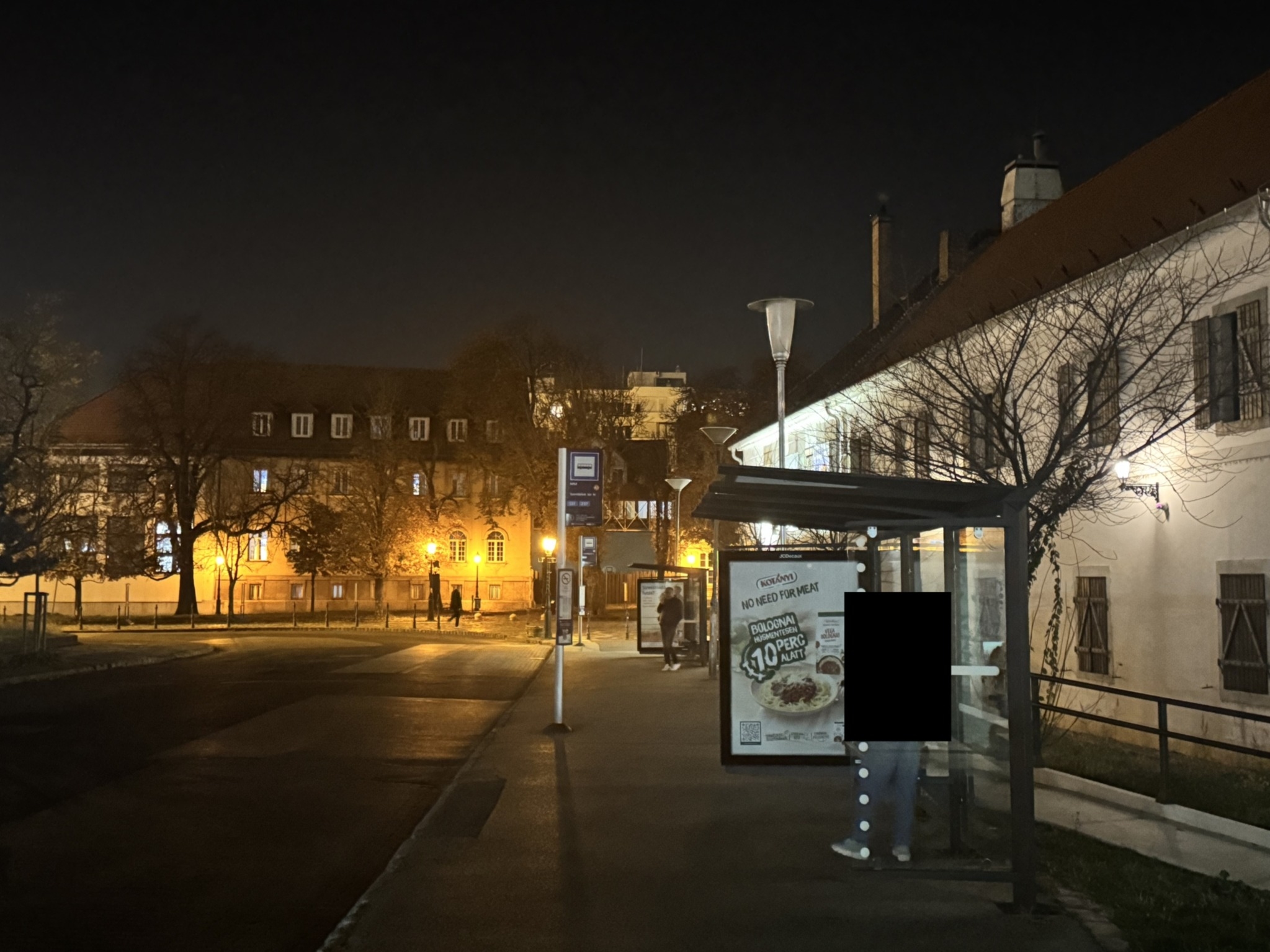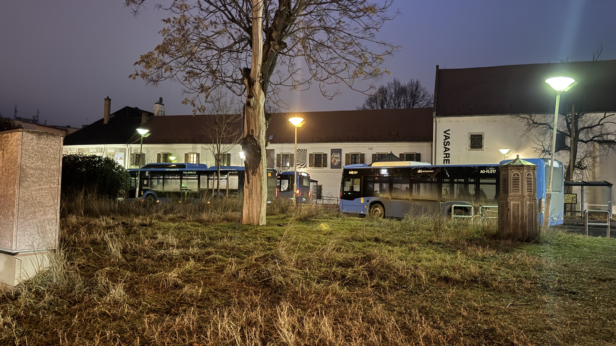 Világitás hiánya a buszállomáson A Szentlélek téren. Egyik lámpa sem ég, csak a környező épületeké.