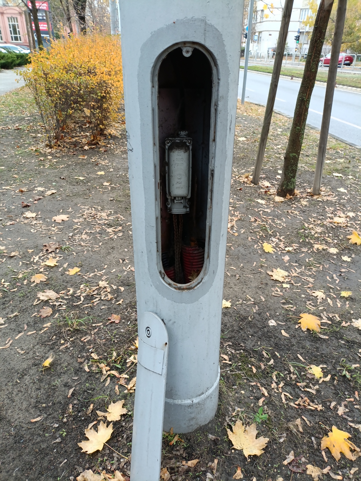 XI kerület Sopron úti Aldi Hengermalom utca felőli sarkánál van egy utcai lámpa és ki van szedve az ajtaja.