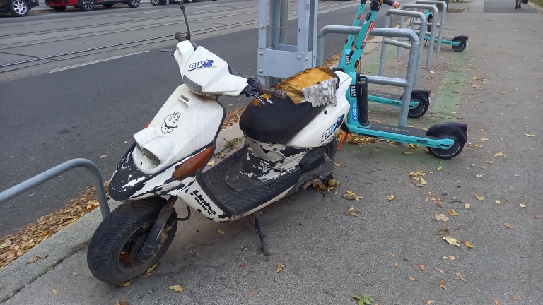 Évek óta mozdulatlanul áll itt egy robogó, akadályozva a rolleresek parkolását.