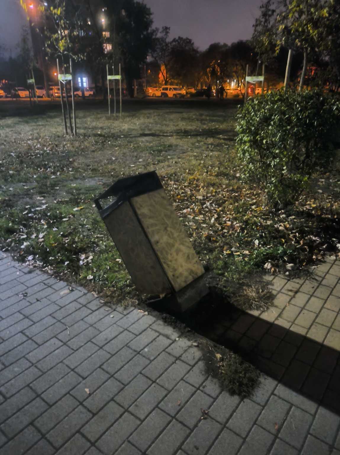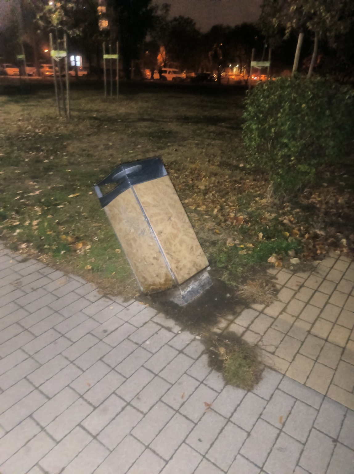A Daru-dombnál a Dunadűlő úttól a pumpapálya felé vezető járda melletti egyik szemetes (az út felől az első) félig ki van dőlve a helyéről.