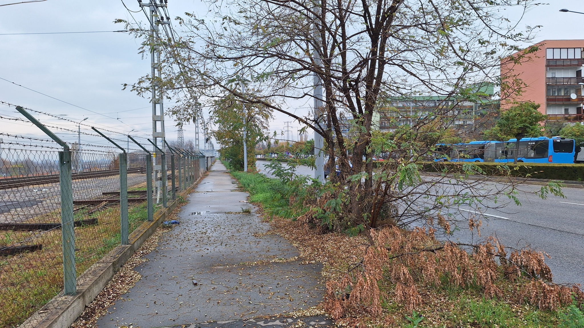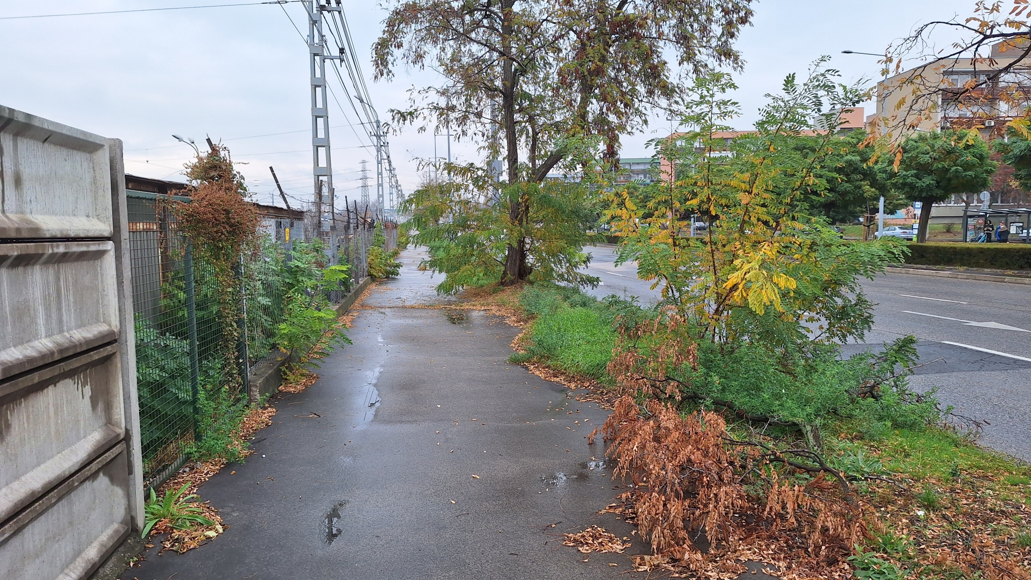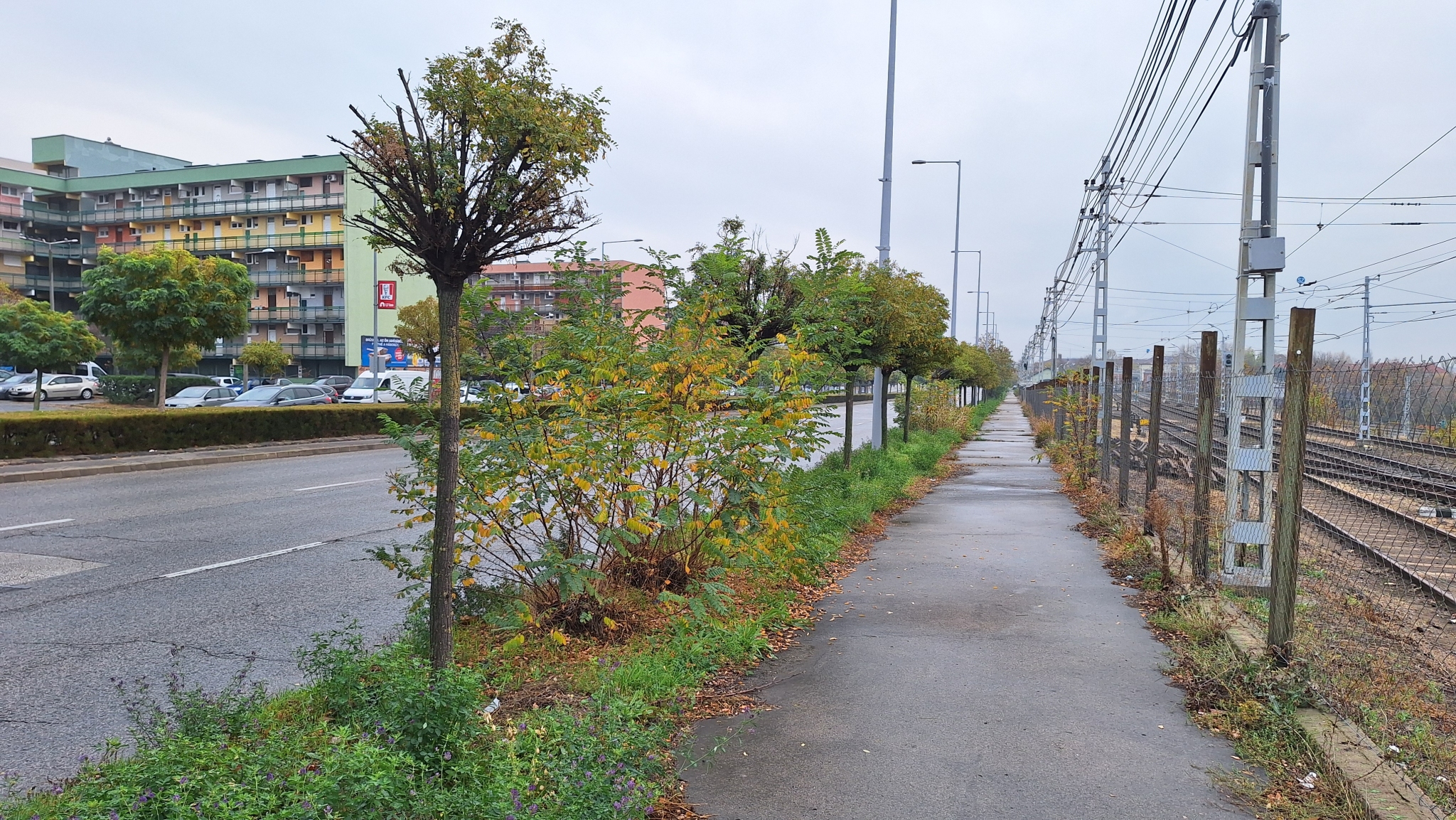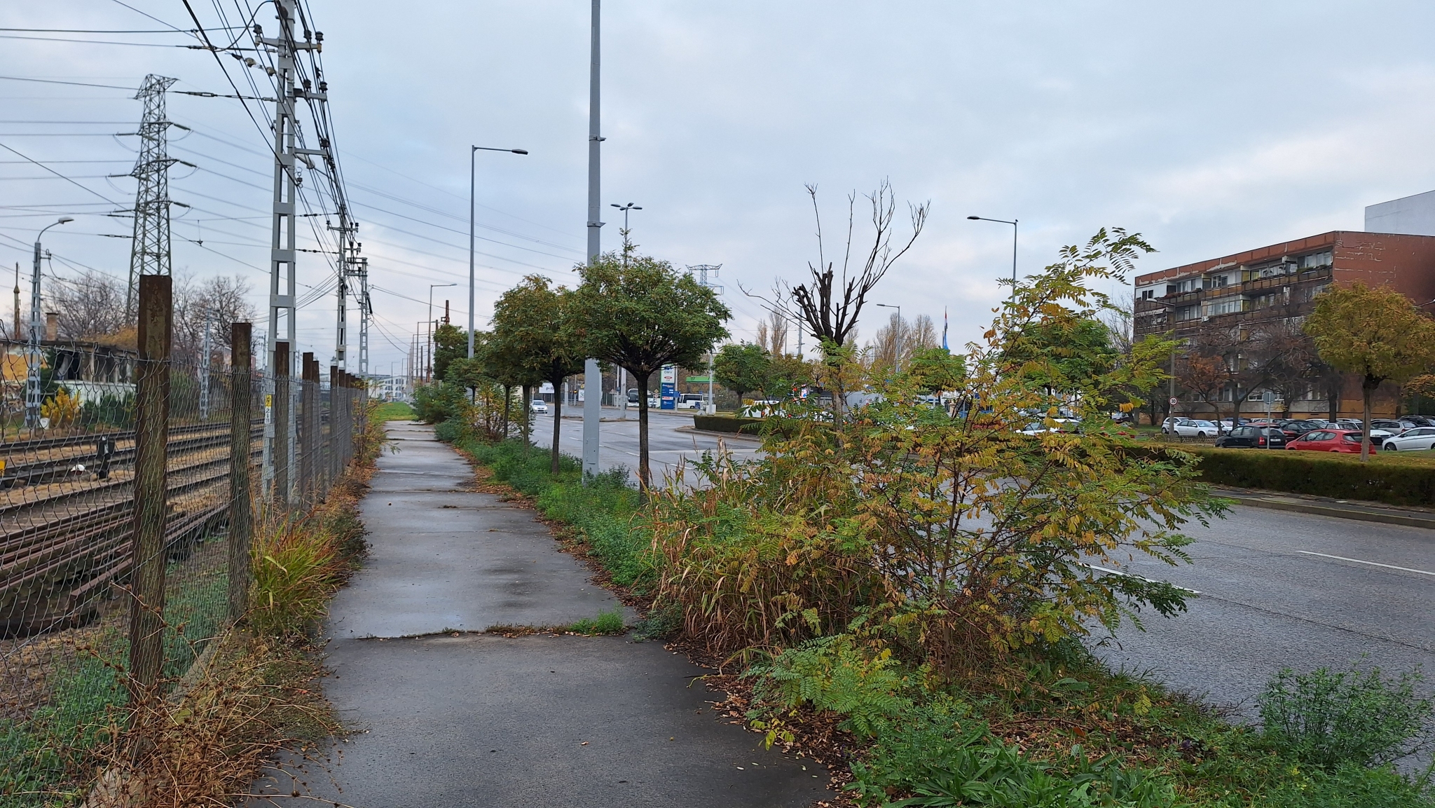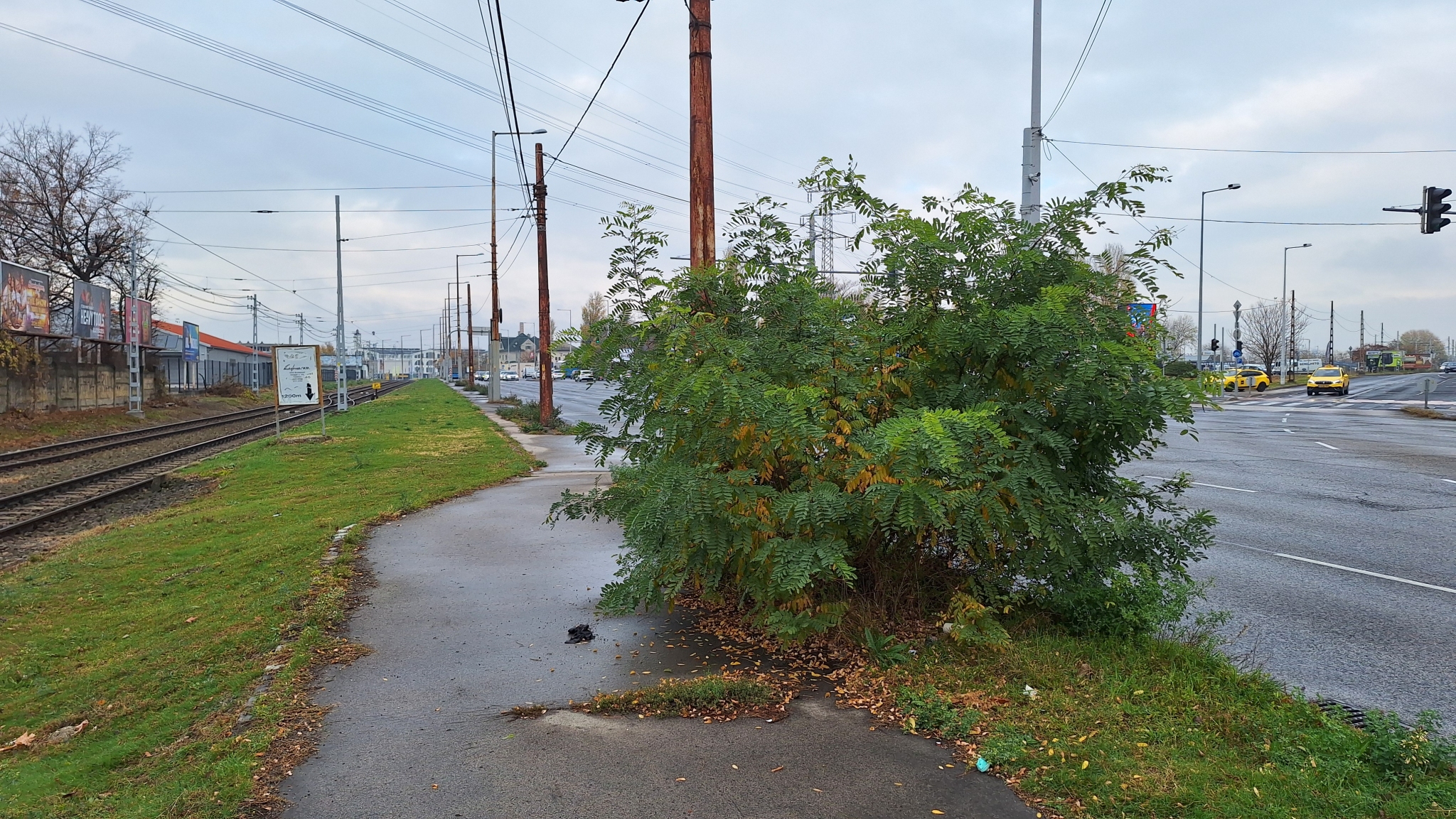 A Helsinki úton a HÉV felőli oldalon alapos metszésre szorulnak a fák, bokrok. Van itt egy kiszáradt facsemete is.
