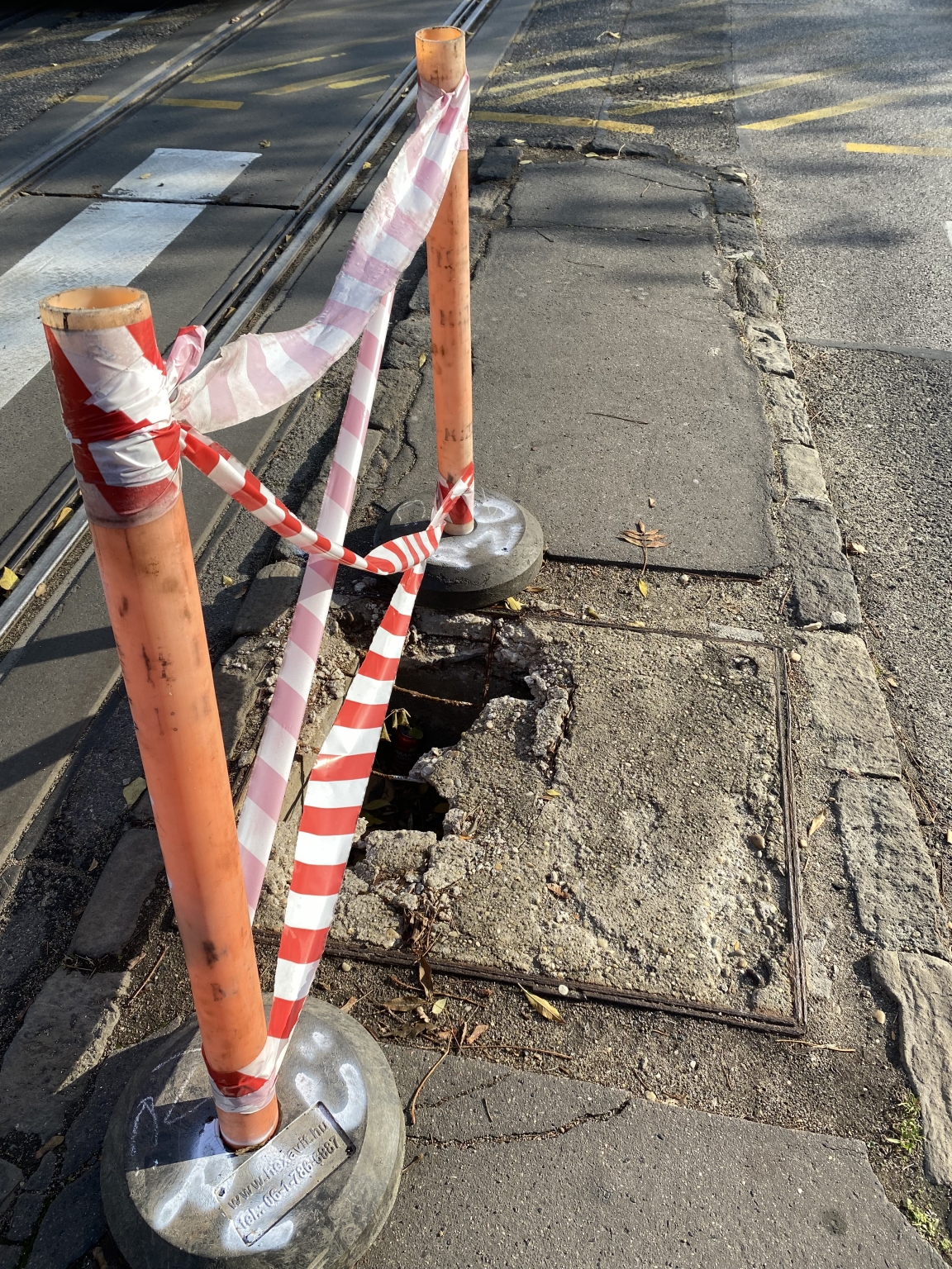 A kispesti Ady E. úton, a 42-es villamos Kossuth L. utcai megállójánál jó pár napja beszakadt a burkolat. A villamosról leszállva ezen a szakaszon kell keresztülmenni a zebrához. (A 42-es villamos vonalának ez az a része, ahol nem újították fel a megállókat, tehát eleve keskeny a megálló, korlát, esőbeálló nincs, akadálymentesítés nem történt.)