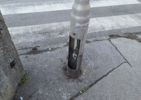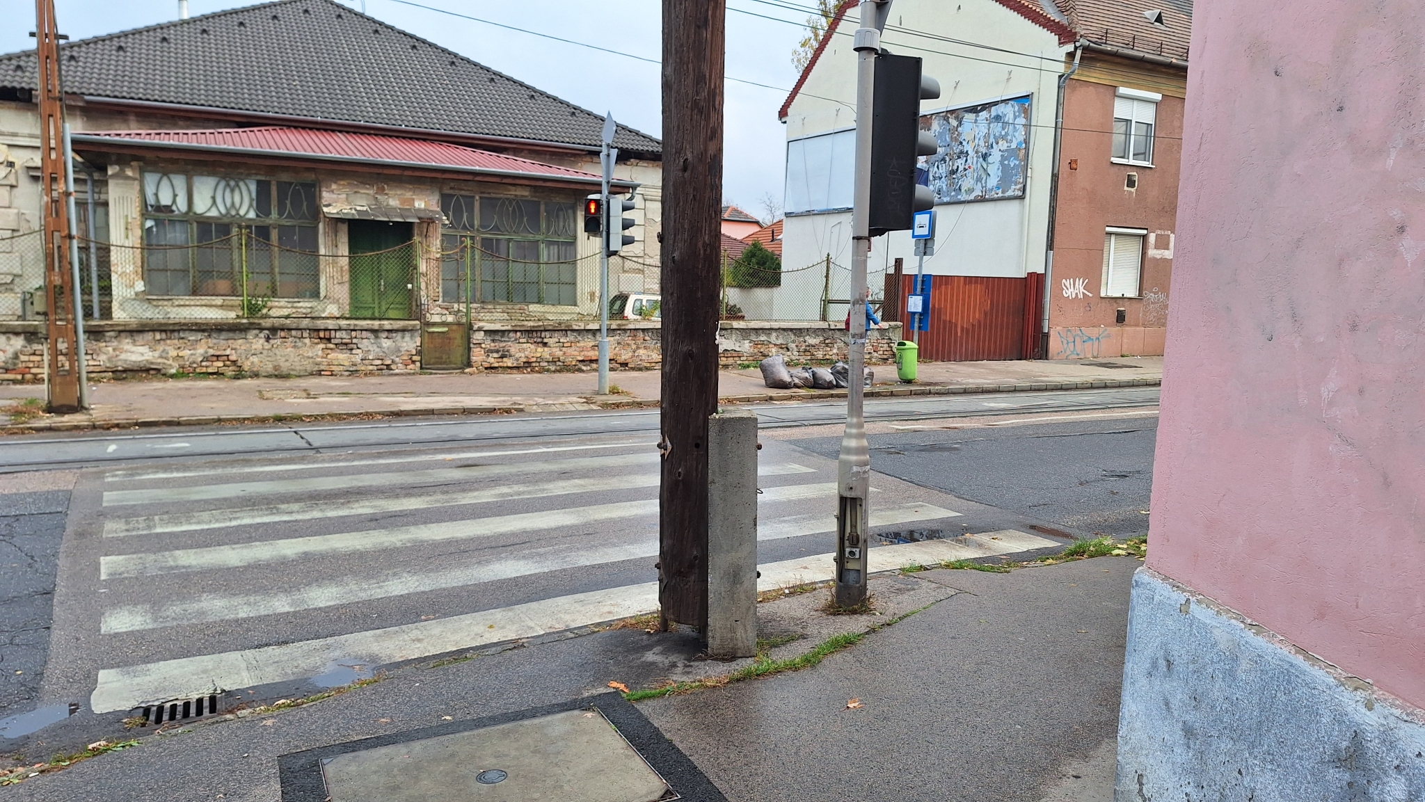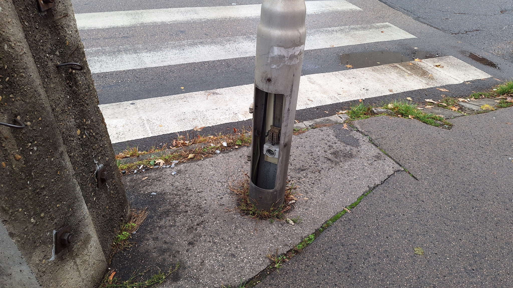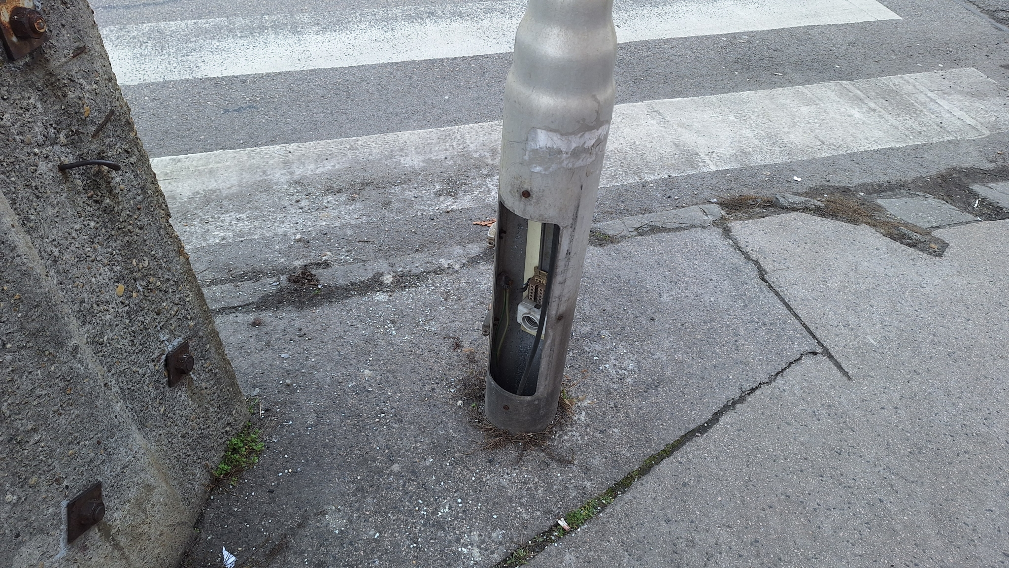 A Kossuth Lajos és Jókai Mór utca sarkánál lévő egyik jelzőlámpa oszlopáról eltűnt a zárófedél.