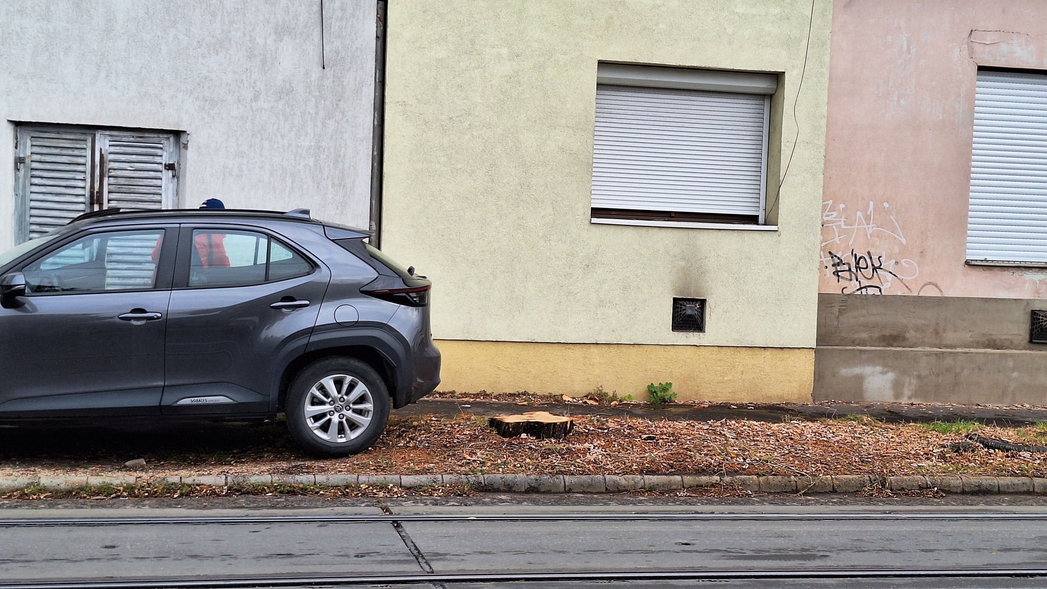 A Jókai Mór utca 79. előtt van egy fatuskó.