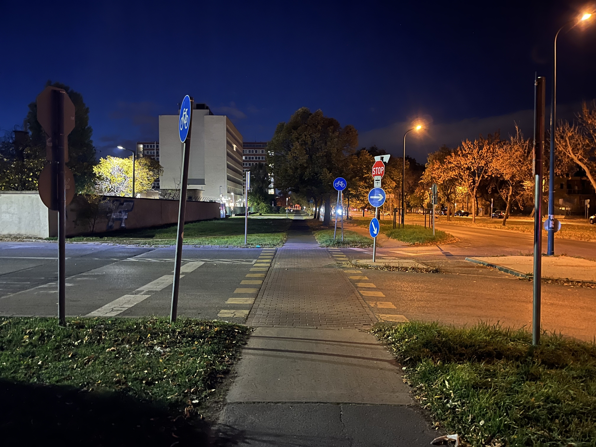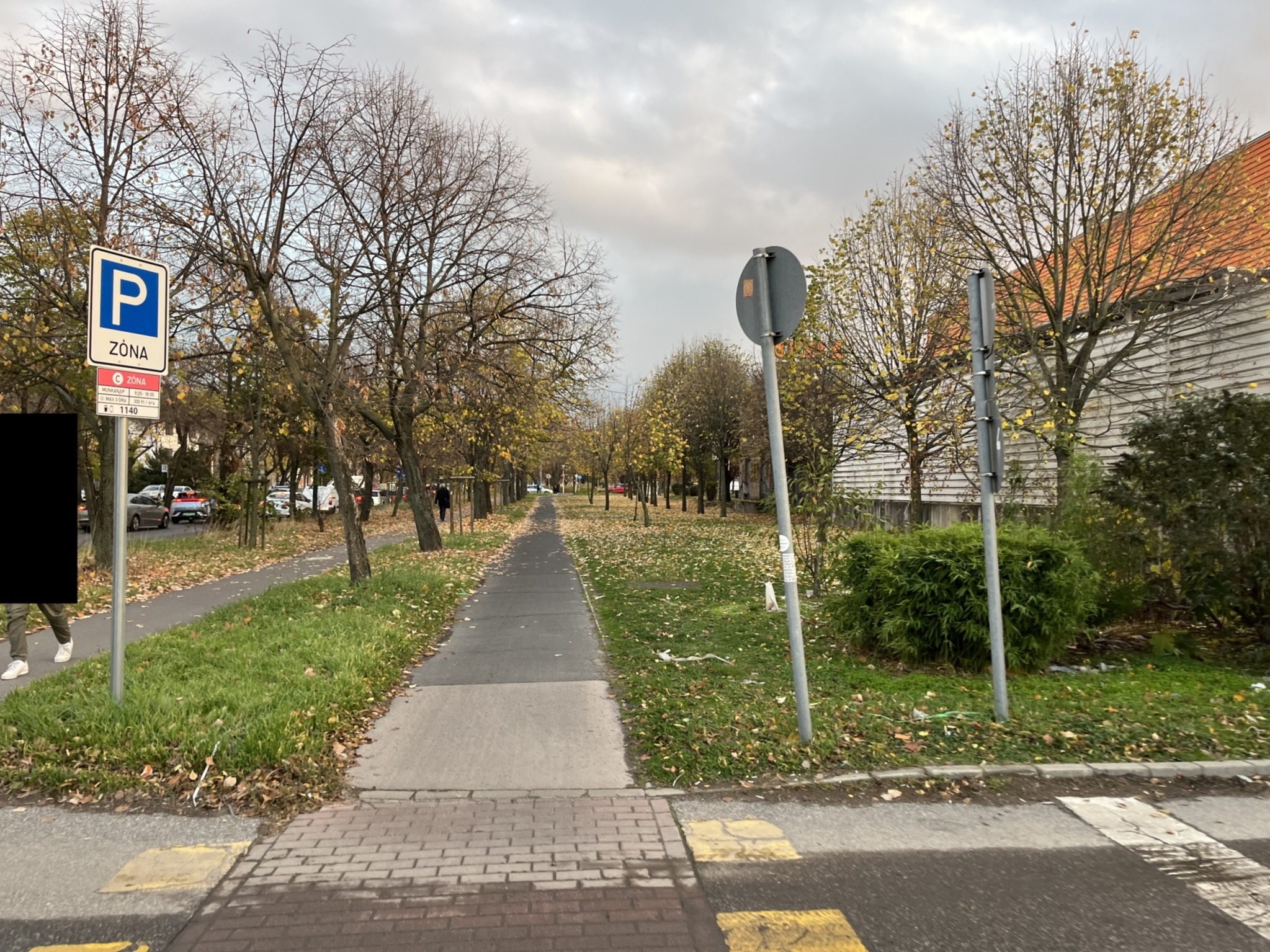 A Róna utcai Obi kijárat egy notórius konfliktuspont, ahol a STOP tábla és a felfestés ellenére sem figyelnek sokan a kerékpározók elsőbbségére. Ezért lenne jó, ha a Fogarasi út felé haladók kerékpárutat jelző tábláját visszaforgatnák és rögzítenék a helyes állásába. Főleg így a sötét évszakban hasznos minden jelzés a balesetek elkerülése érdekében.