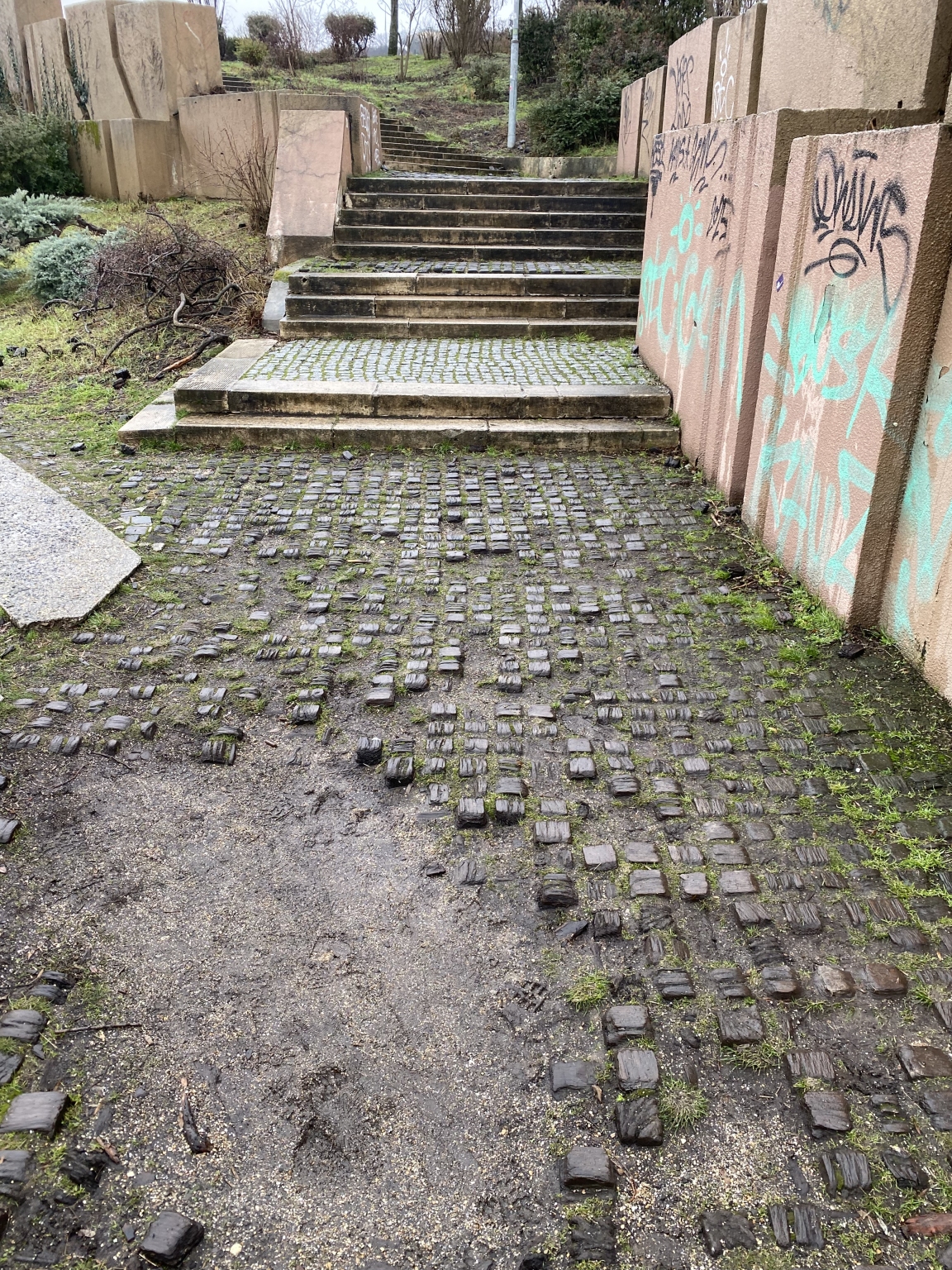 Van egy fakockákkal kirakott lépcsős út a hegyalja út felől a gellért-hegyi víztározón lévő kilátókő szoborhoz. Az utóbbi időben annyira sok fakocka rohadt szét, hullott ki, tűnt el, hogy mára bokatörő akadálypálya átjutni ezen a szakaszon.