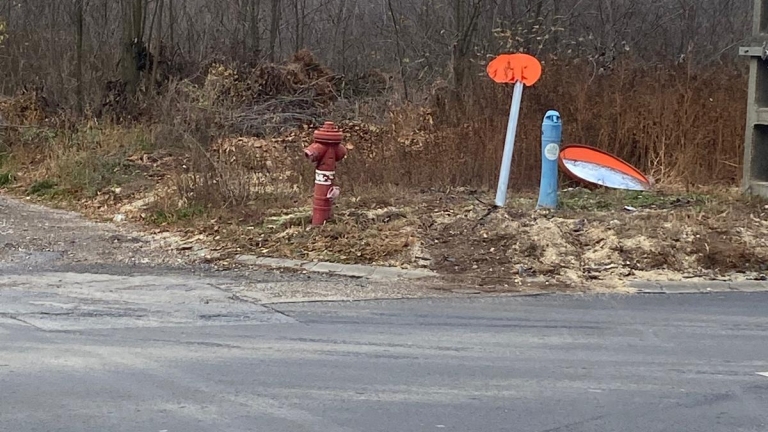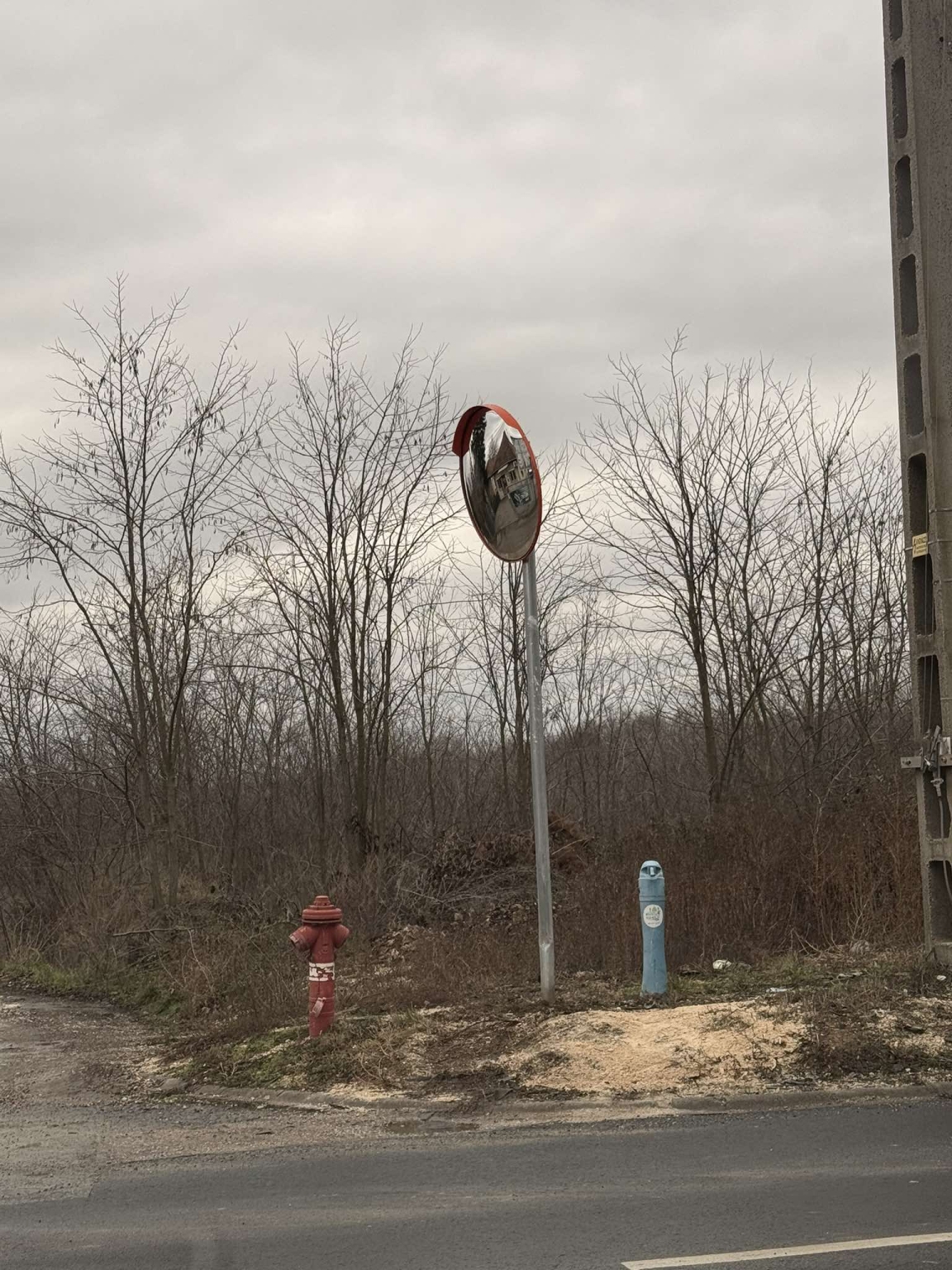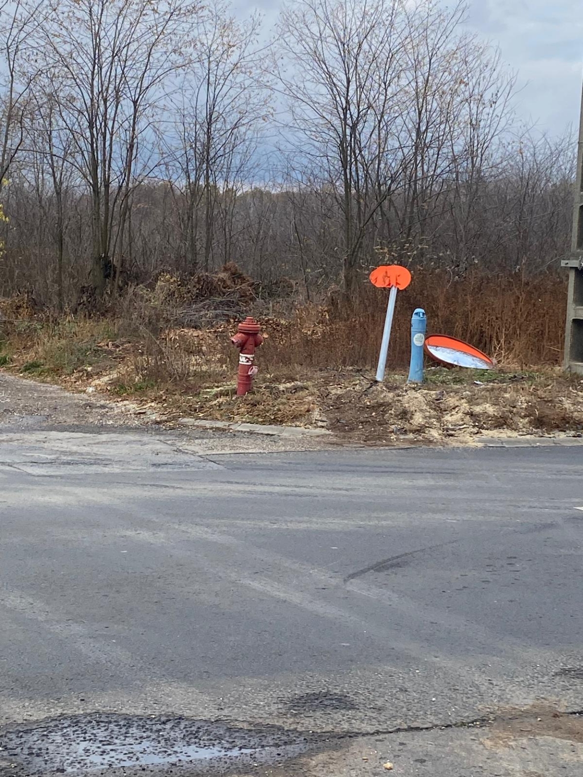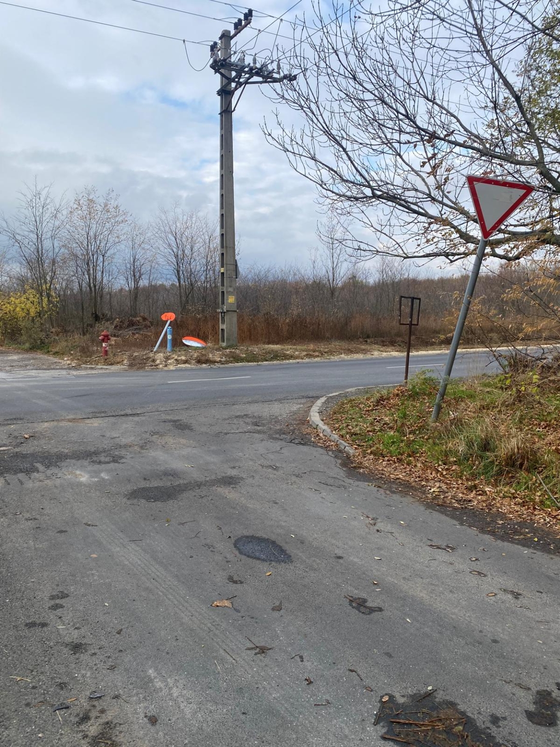 A közelmúltban történt baleset következtében a közlekedésbiztonsági tükör kidőlt, valamint az „Elsőbbségadás kötelező” jelzőtábla jelentősen megdőlt, ez okozhatta a balesetet. A sérült eszközök nem biztosítják megfelelően a közlekedésbiztonságot, és ez a hiányosság további balesetet okozhat, a főútra való kanyarodás nehézsége miatt.