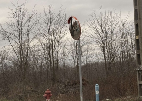 Kidőlt közlekedésbiztonsági tükör, megdőlt jelzőtábla