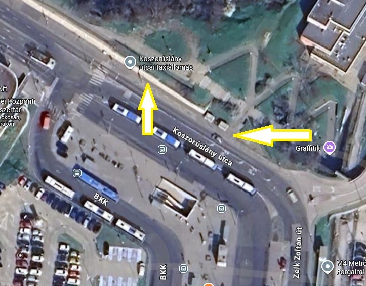 A Koszorúslány utca járdáján a jelölt helyeken üvegszilánkok vannak (az egyik adag két hete).