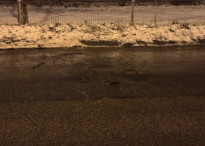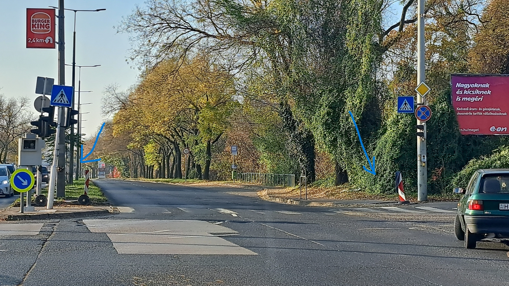 A járdán befejezetlen az aszfaltozás, az aknatető kilóg. Terelőtábla a tetején, illetve az úttest elválasztó sávban további otthagyott terelőtáblák. Hosszabb ideje.