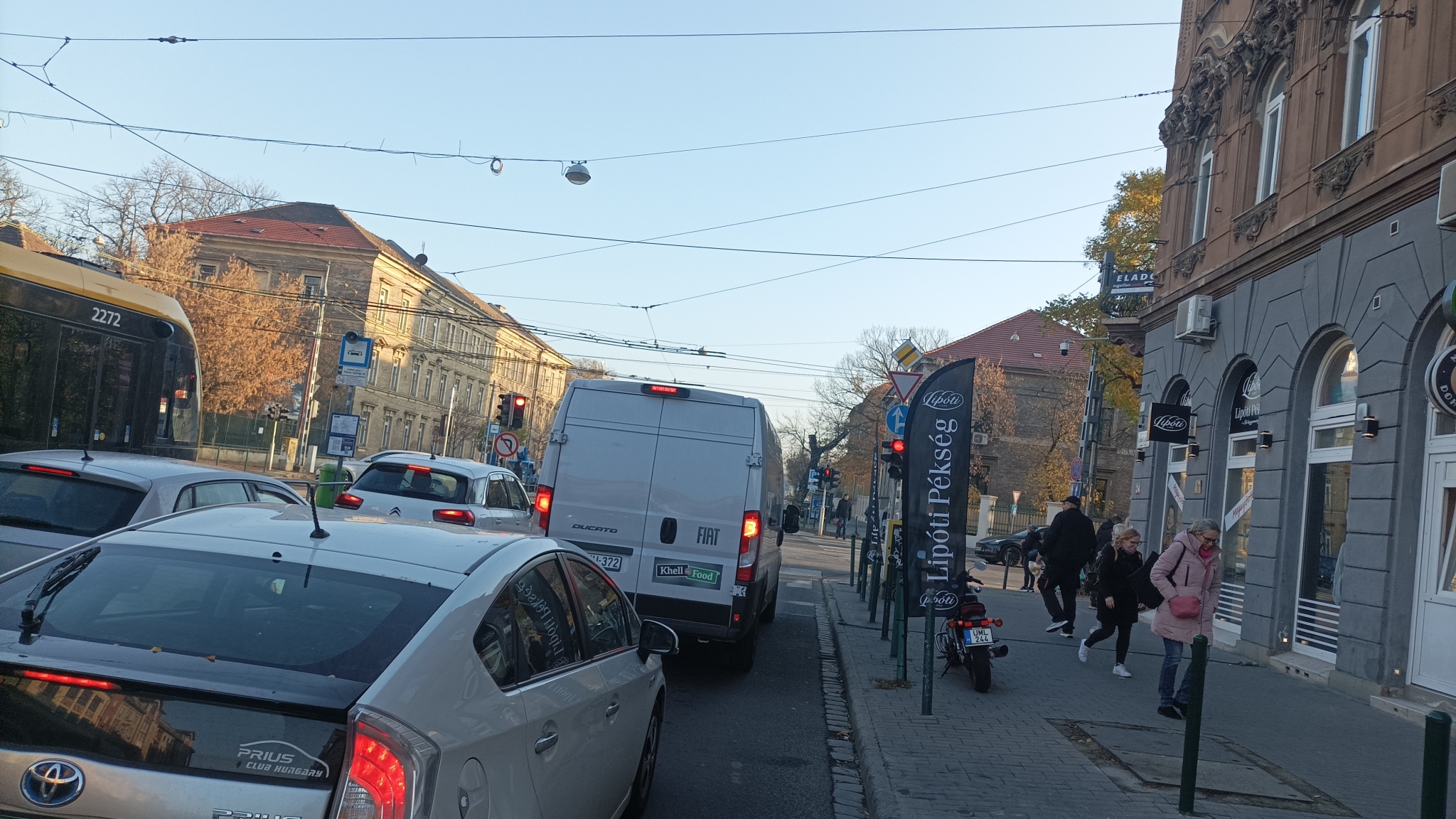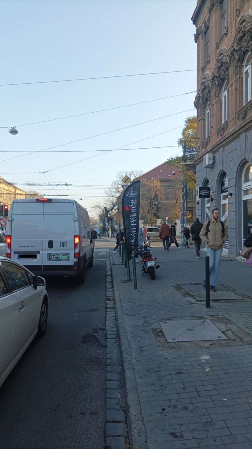 A jelzett sarkon lévő pékség az utóbbi napokban saját megát hirdető zászlókat helyezett ki az út szélére a parkolásgátló oszlpokhoz rögzítve. A kihelyezett zászlók a szél járásától függően sokszor kitakarják a forgalom elől az egyik jelzőlámpát.