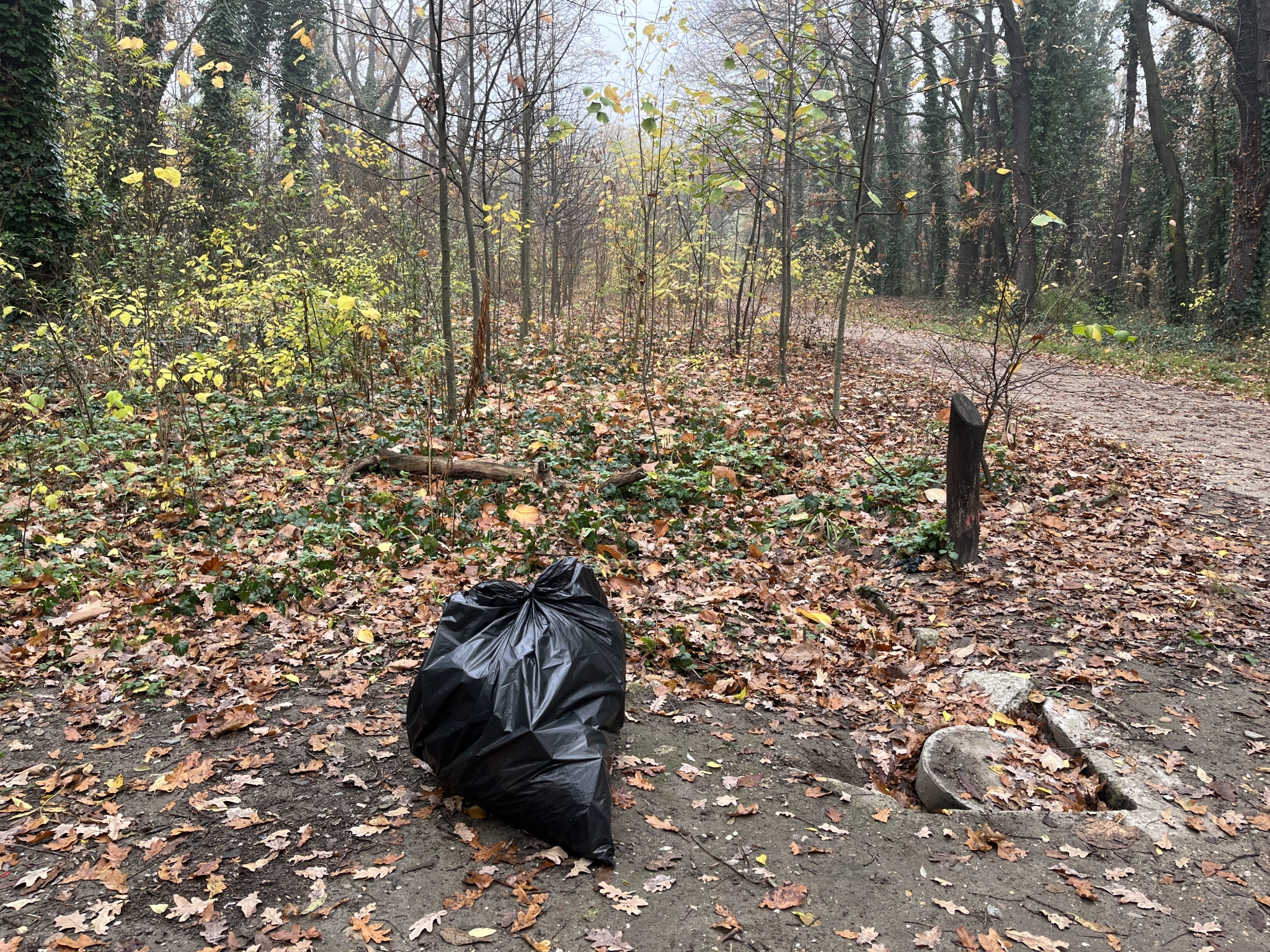 Kollégáink gyűjtötték össze az erdei szórt hulladékot a fekete zsákban, előkészítve az elszállításra. Munkatársaink begyűjtötték a zsákot.