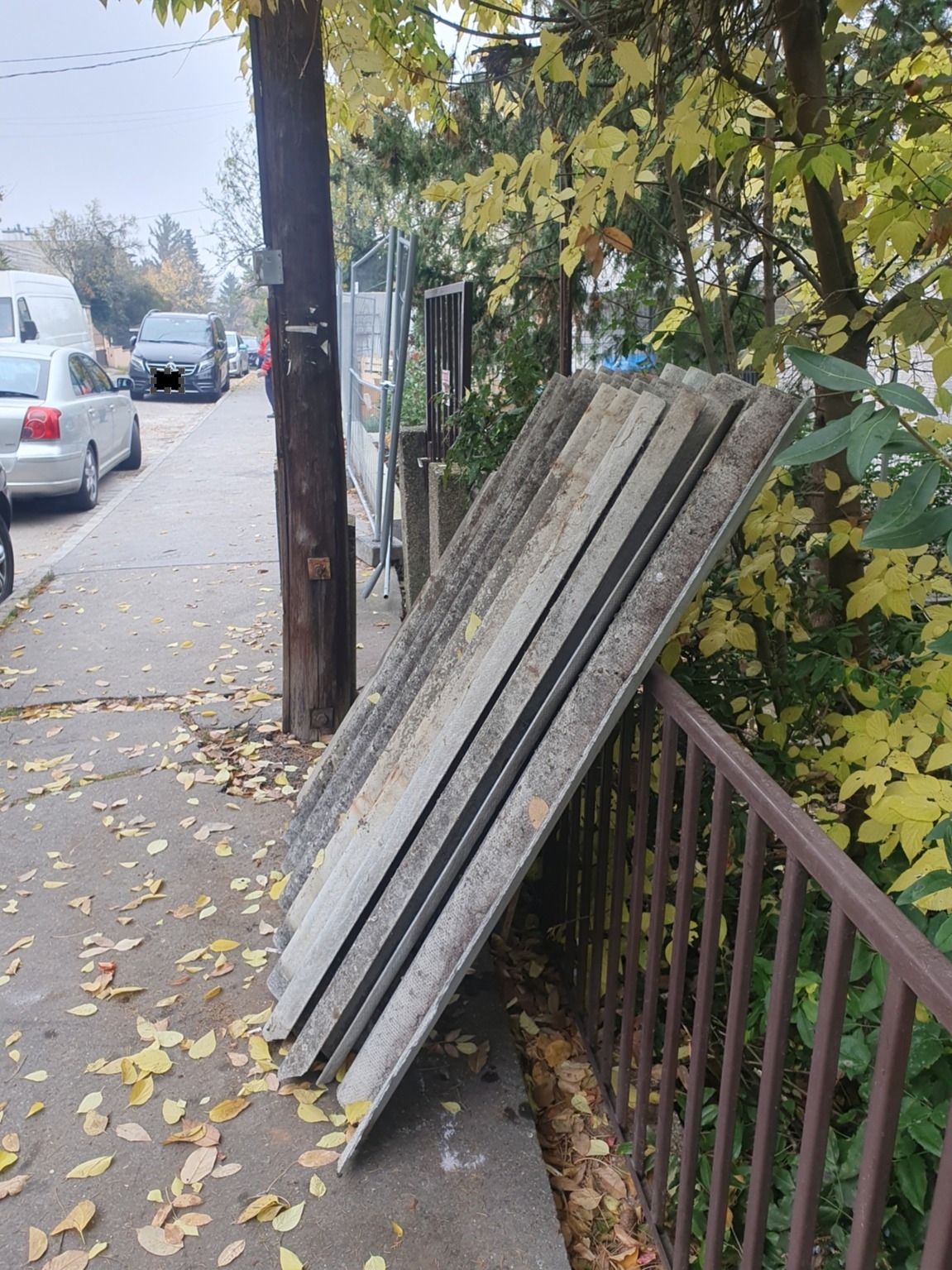 A 2025. november 7-i lomtalanítást követően illegálisan kihelyezett hullámpala maradt az utcán, amelyet később valakik a házunk kerítésének támasztottak. Kérem a tisztelt illetékeseket, hogy szíveskedjenek intézkedni az ügyben. Előre is köszönöm a segítségüket!
