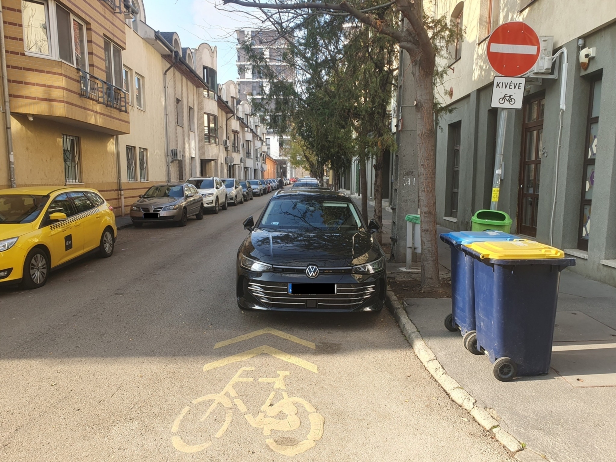 Jól láthatóan az egyik oldalra fel vannak festve a parkolóhelyek, de a másik oldaon nincs felfestés parkolóhelyeknek, ellenben, ahogy a fotón is látható a bicikliforgalom kijelölt helye lenne.