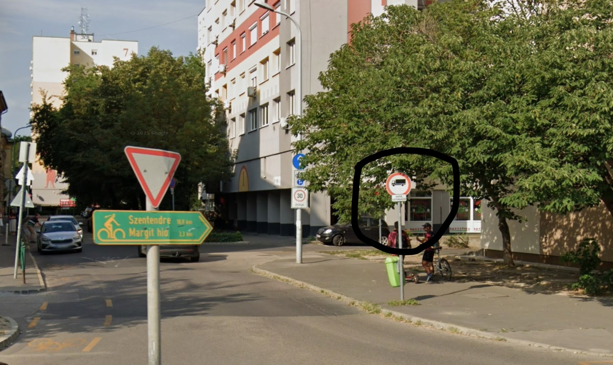 A Tavasz utca - Polgár utca sarkán lévő, célforgalmat tiltó tábla aszfalttal együtt dőlt meg. Most körülbelül 30 fokos szöget zár be a függőlegessel és körülötte állnak az aszfalt darabok.
