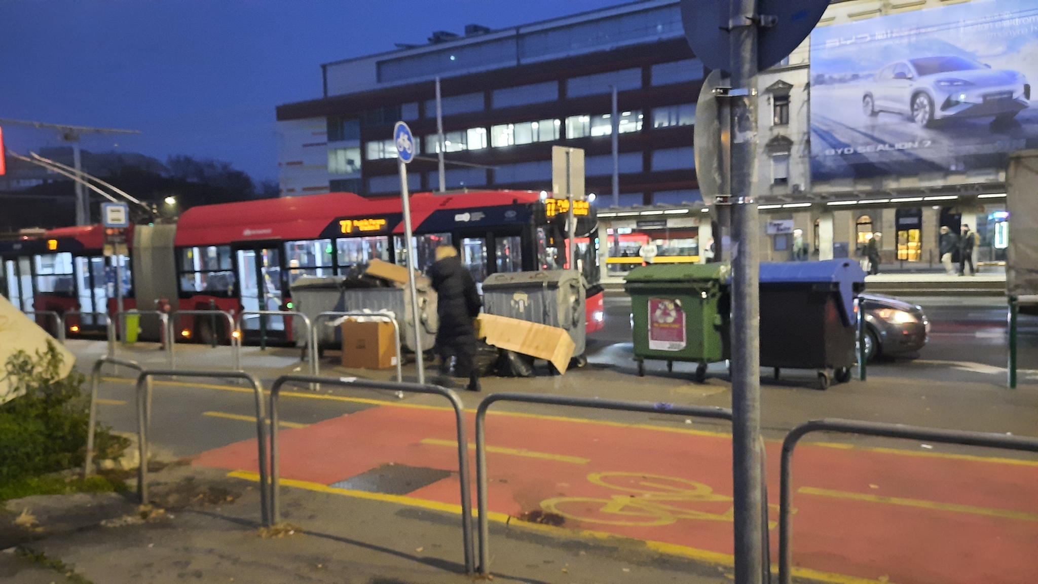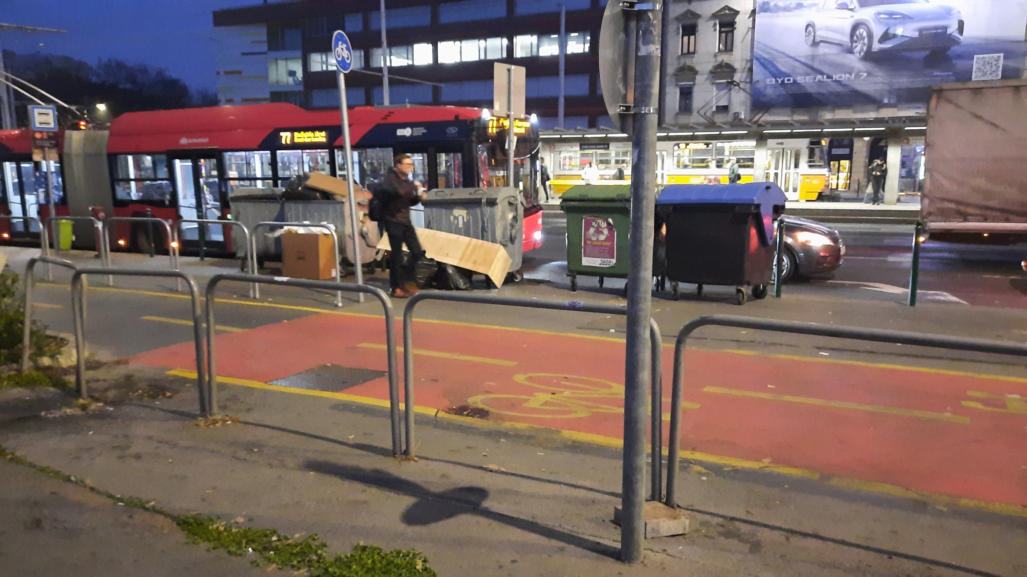 Viszont cserébe a trolimegállót jelző tábla előtt a gyalogos járda nagy részét elfoglalva 5-6 db 1 köbméteres kommunális hulladéktároló került kihelyezésre.