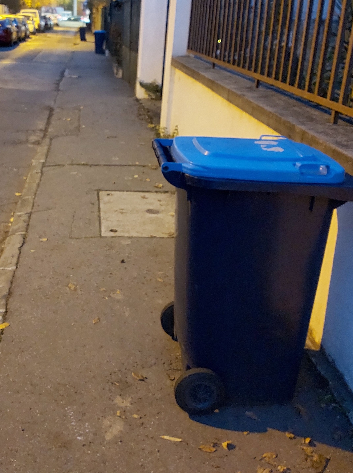 A mellékelt fényképen a keskeny járdán sokszor napokig állnak a kukák, most is (2025. 11. 12.) második napja.